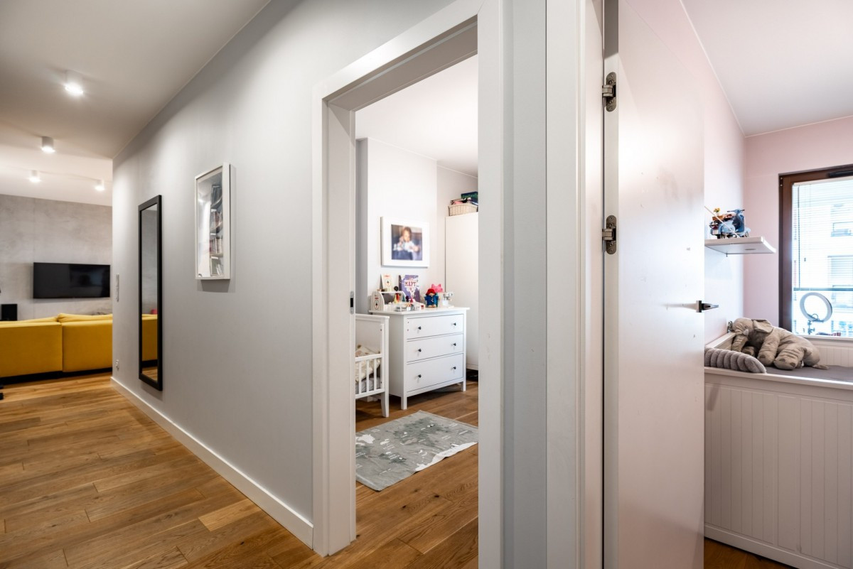 Apartament został starannie zaprojektowany przez architekta, łącząc funkcjonalność z najwyższym komfortem. Wnętrza wykończono materiałami najwyższej jakości, a elegancka, ponadczasowa deska dębowa nadaje przestrzeni wyjątkowego charakteru.