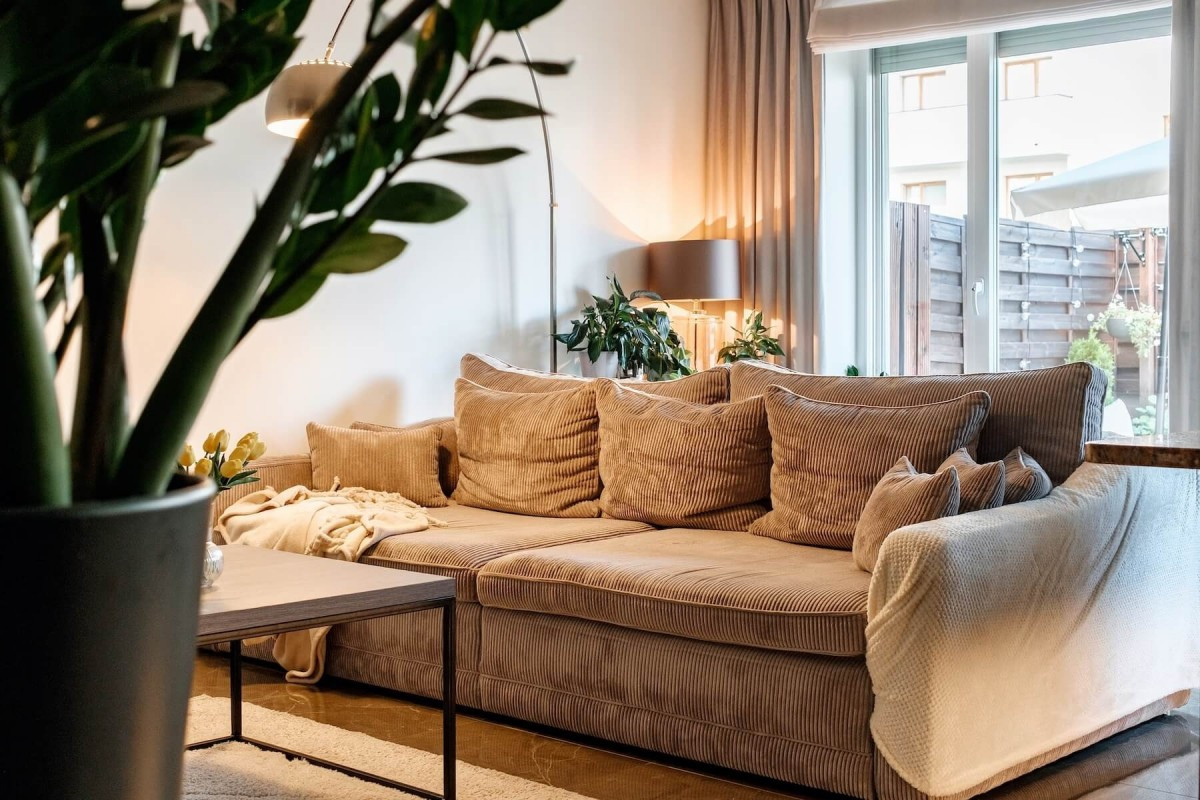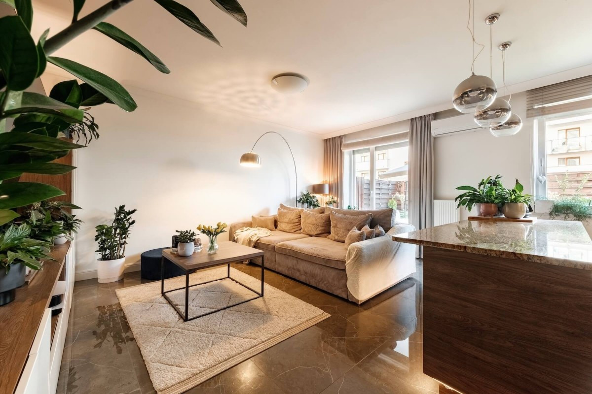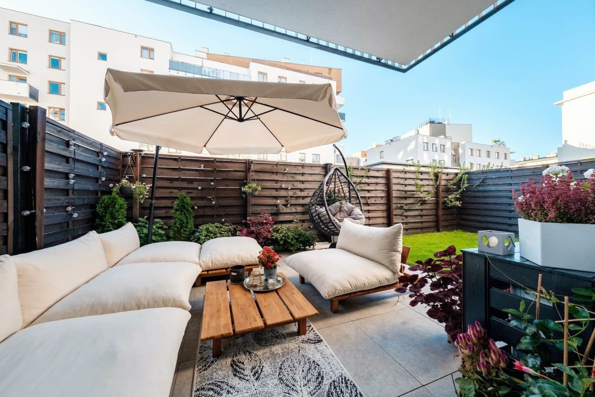 Salon z wyjściem na prywatny ogródek (35 m²) - idealny na relaks i spędzanie czasu na świeżym powietrzu
