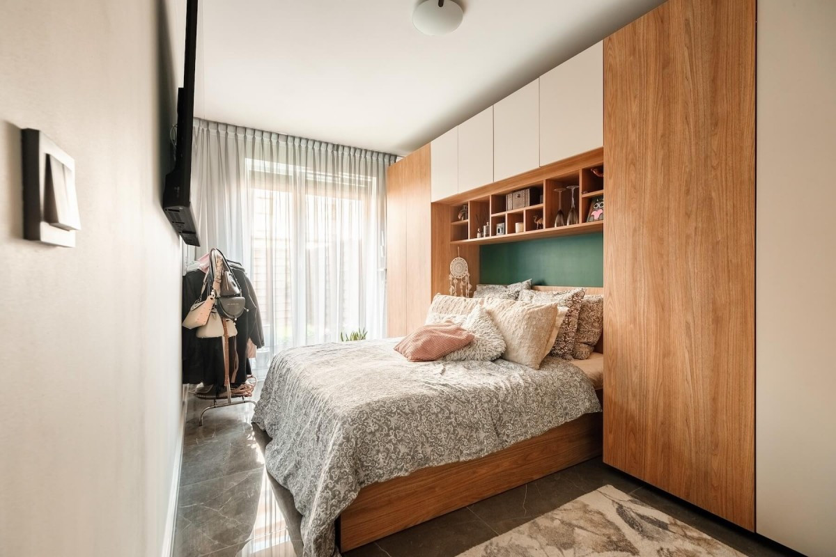 Sypialnia z dużymi oknami, które wypełniają wnętrze naturalnym światłem