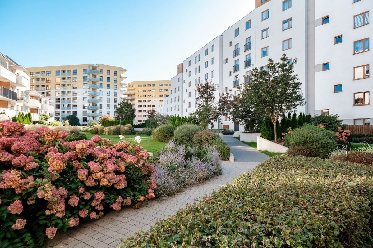 Nowoczesne osiedle z 2018 roku od Dom Development charakteryzuje się wysokim standardem, zadbaną infrastrukturą i licznymi nasadzeniami. Znajdziesz tu zamknięte patio, które zapewnia spokój oraz bezpieczeństwo, a także tereny zielone i miejsca do spacerów. Osiedle jest monitorowane, co zapewnia komfort mieszkania.