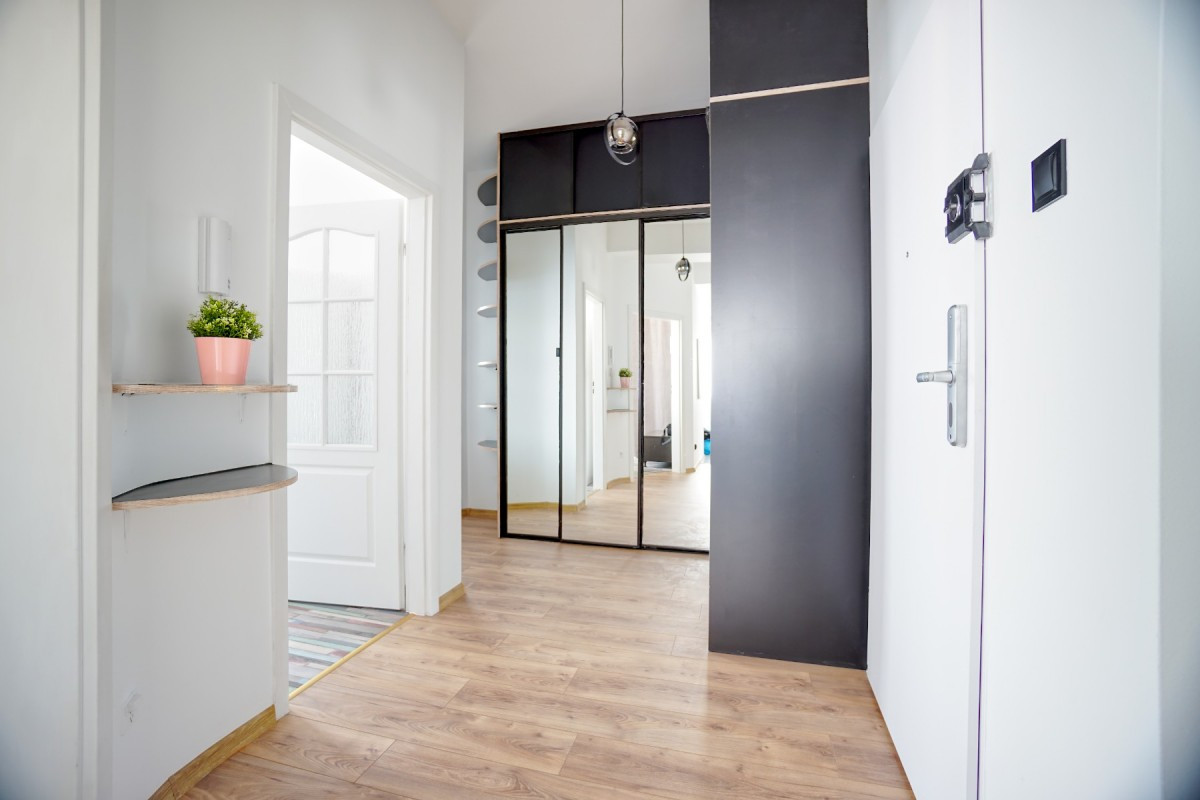 Przestronny korytarz z pojemnymi szafami wnękowymi