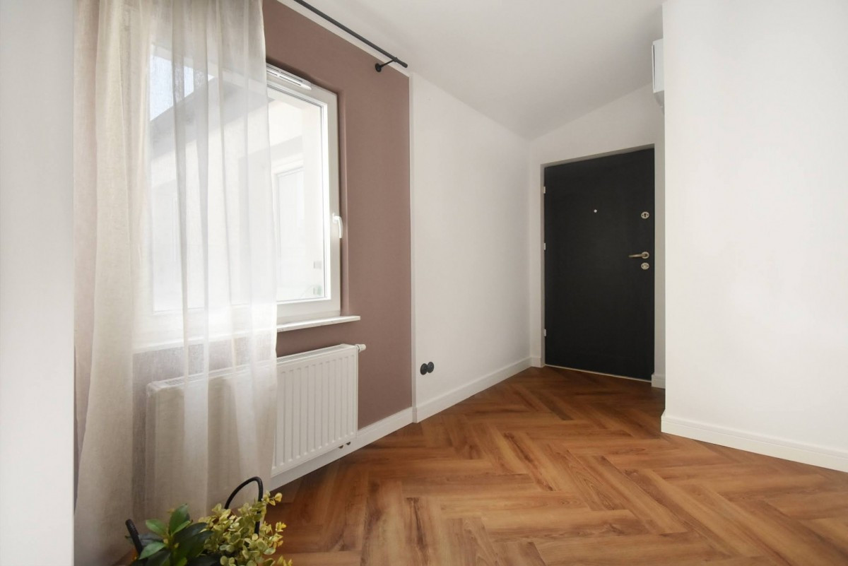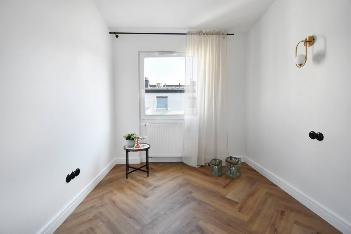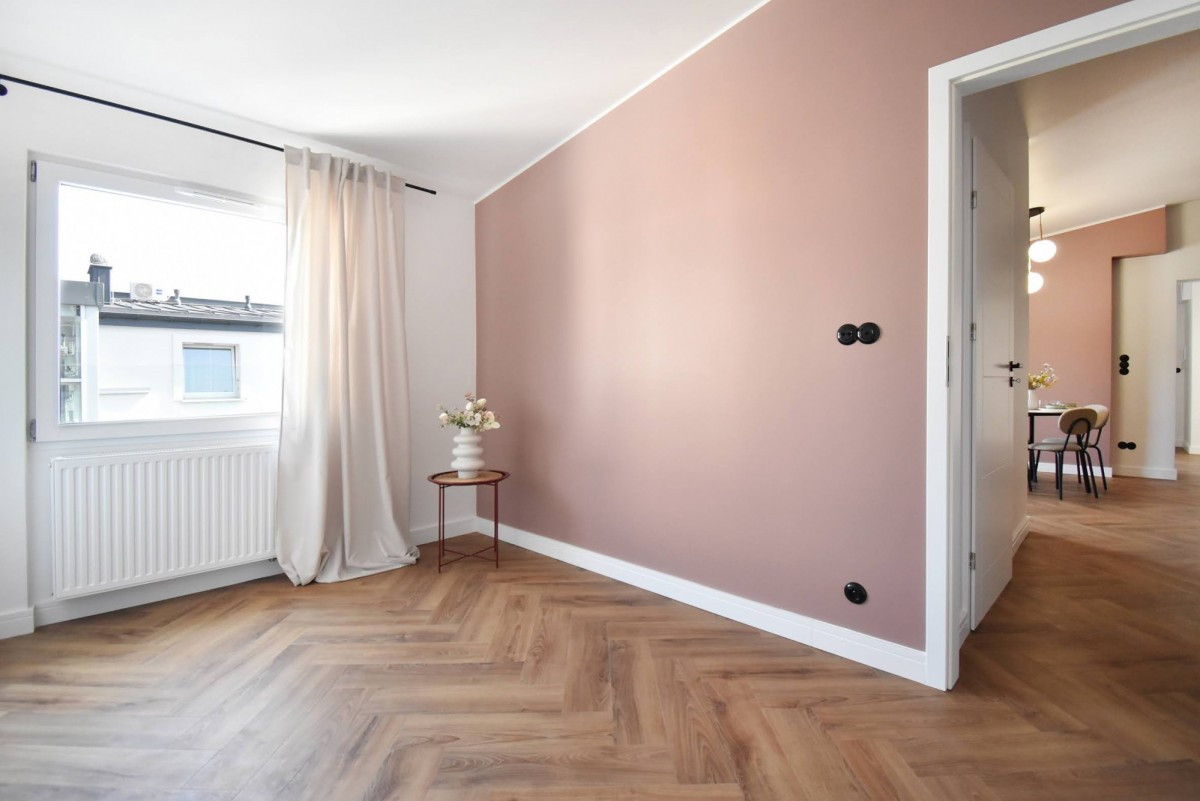 Całość została niezwykle gustownie zaprojektowana i wykonana pod okiem projektantki wnętrz. Mamy tu bardzo dobrej jakości materiały - niezniszczalne panele winylowe, piękne tapety oraz kuchnię na wymiar.