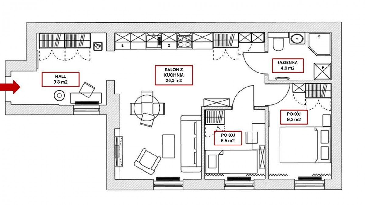 Układ lokalu jest nowoczesny - hall (dzięki oknu) może pełnić rolę gabinetu a z salonu przechodzi się do pozostałych pomieszczeń.