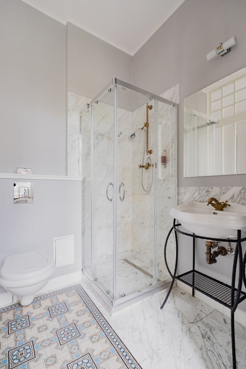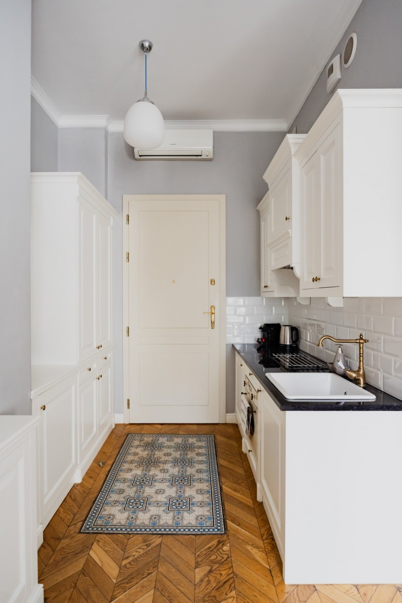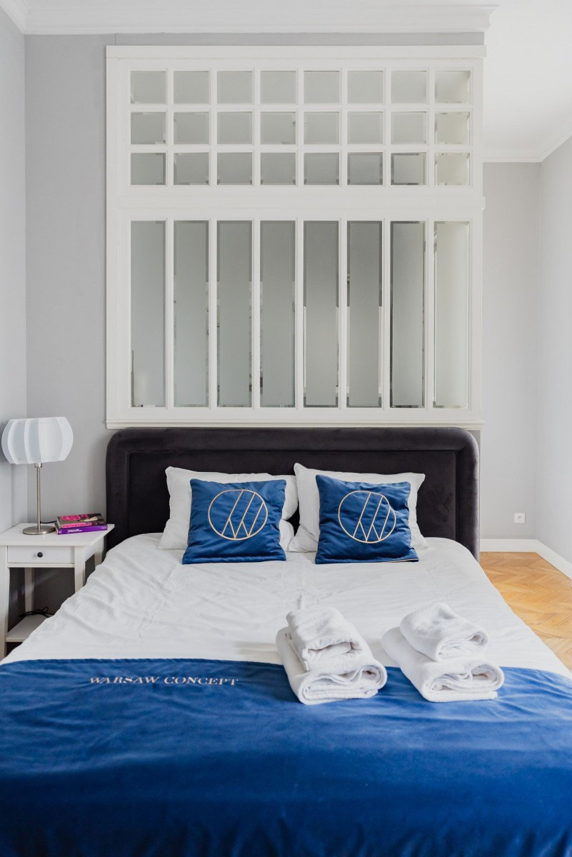 Mieszkanie mimo niewielkiego metrażu zostało zaprojektowane tak, że mamy poczucie jasnej i otwartej przestrzeni. Wszystko dzięki wysokim oknom z okiennicami na ulicę Wspólną, a także dzięki wysokości pomieszczenia na 3,5m! Kuchnia otwarta w pełni wyposażona, w zabudowie na wymiar, Kuchenka smeg, płyta amica, zastawa z porcelany Cmielów, pralka, express do kawy. W kuchni podłoga dębowa kładziona na francuską jodełkę łączy się z cementowymi dywanami z płytek z ponad 100 letniej kamienicy w Paryżu. Łóżko robione według projektów specjalnie do tego wnętrza, z szufladą. Atmosfery temu miejscu dodaje bio kominek. W łazience piękny marmur, prysznic, stylowe baterie.