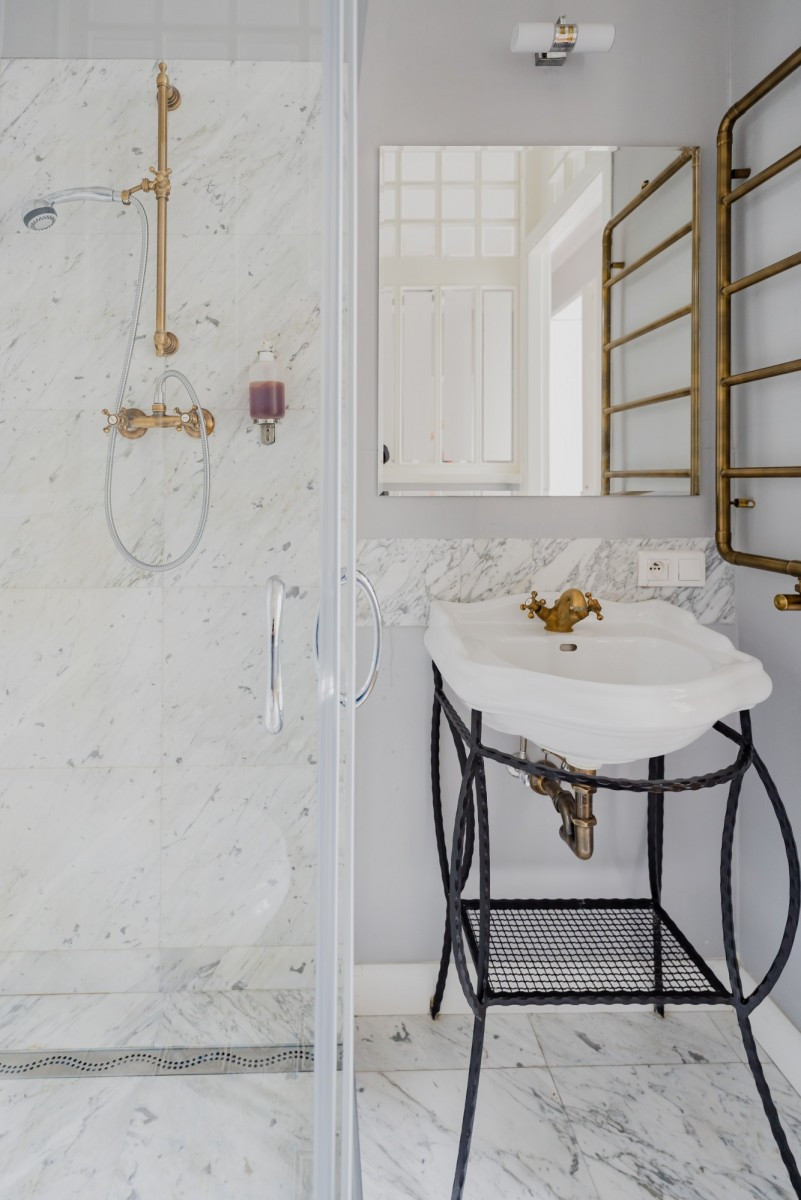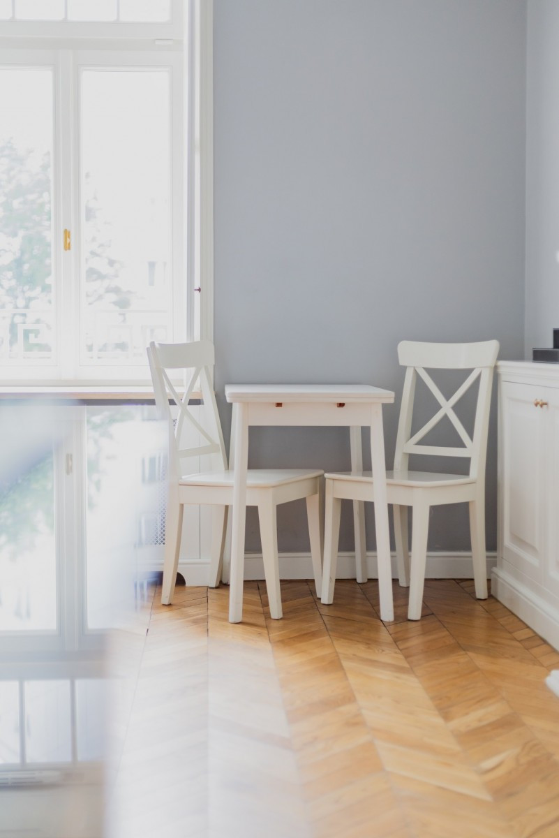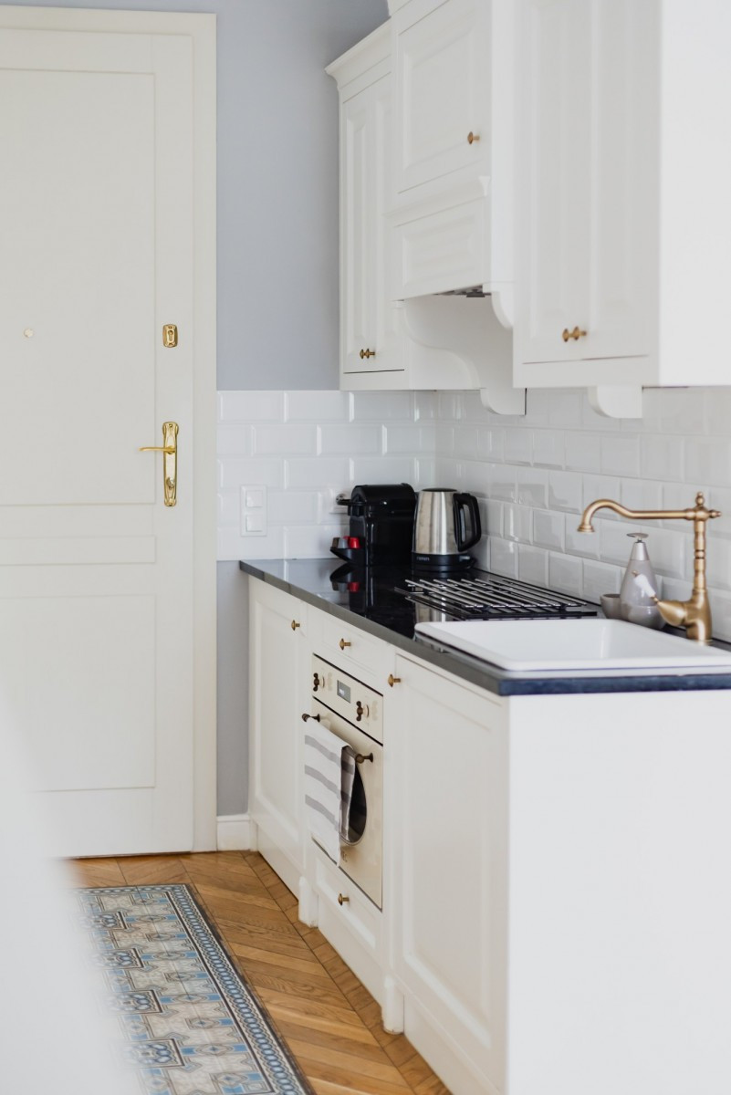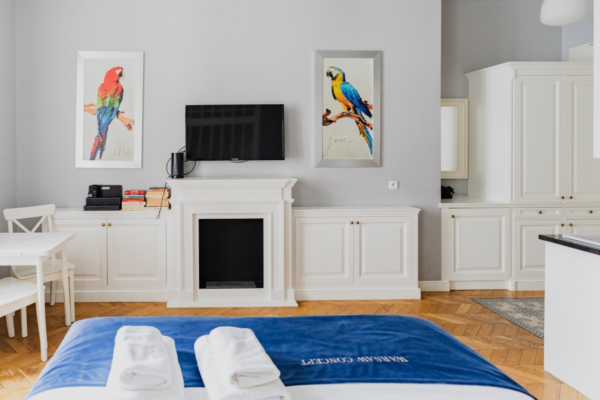 Mieszkanie mimo niewielkiego metrażu zostało zaprojektowane tak, że mamy poczucie jasnej i otwartej przestrzeni. Wszystko dzięki wysokim oknom z okiennicami na ulicę Wspólną, a także dzięki wysokości pomieszczenia na 3,5m! Kuchnia otwarta w pełni wyposażona, w zabudowie na wymiar, Kuchenka smeg, płyta amica, zastawa z porcelany Cmielów, pralka, express do kawy. W kuchni podłoga dębowa kładziona na francuską jodełkę łączy się z cementowymi dywanami z płytek z ponad 100 letniej kamienicy w Paryżu. Łóżko robione według projektów specjalnie do tego wnętrza, z szufladą. Atmosfery temu miejscu dodaje bio kominek. W łazience piękny marmur, prysznic, stylowe baterie.