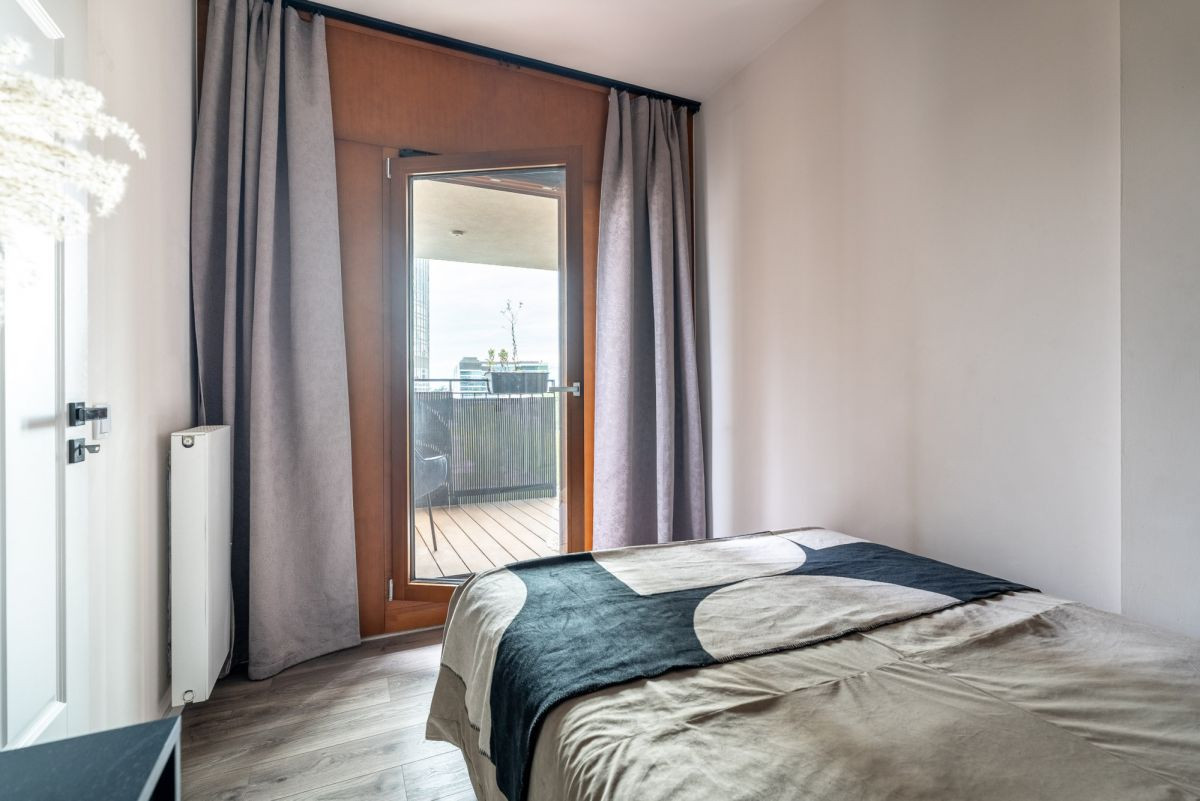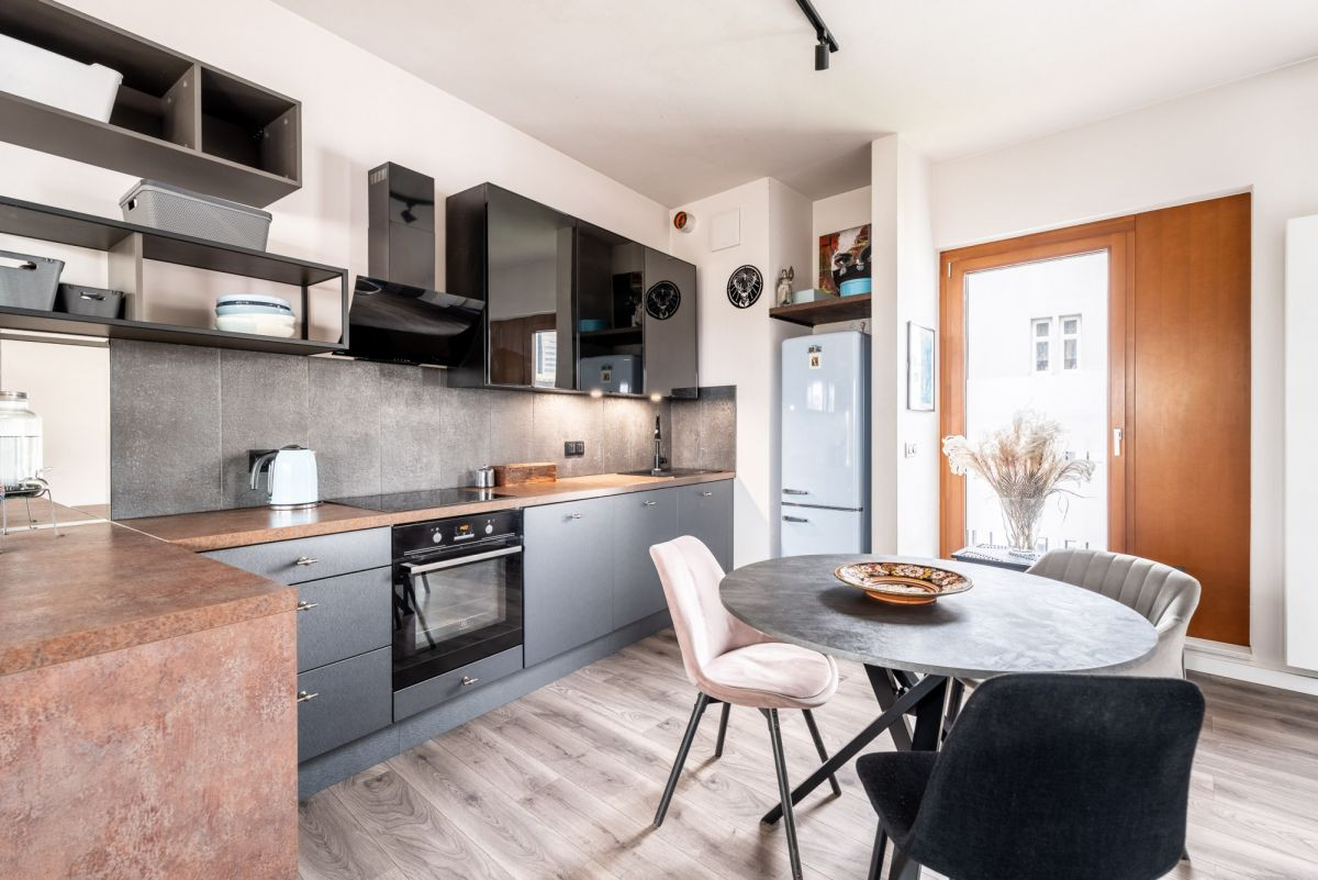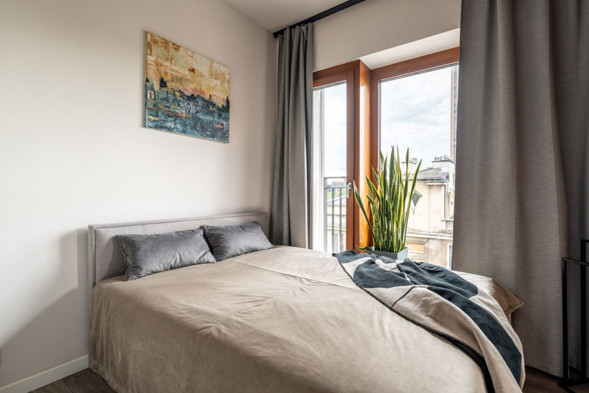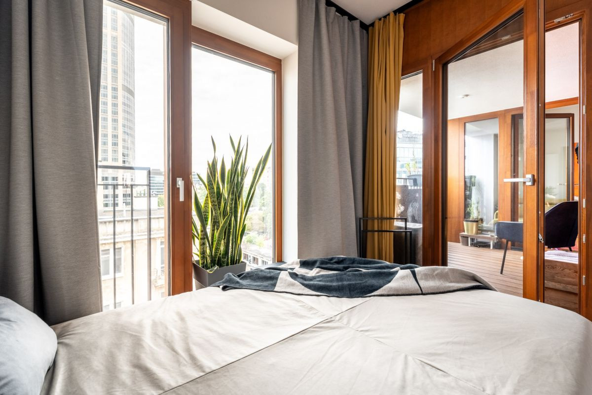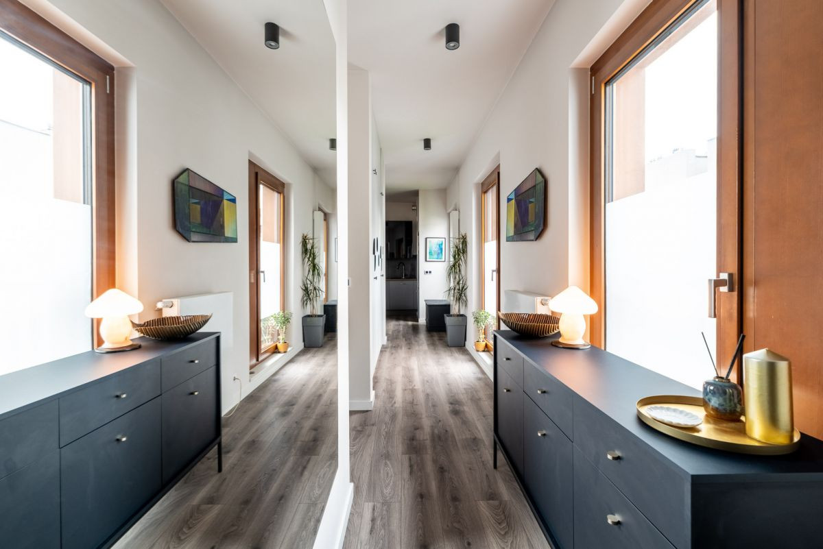 Drewniana stolarka okienna dodaje ciepła i elegancji, jednocześnie zapewniając doskonałą izolację akustyczną - to ciche mieszkanie w samym sercu miasta. Przemyślana przestrzeń do przechowywania z dużymi szafami w zabudowie w korytarzu oraz dodatkową szafą w sypialni.