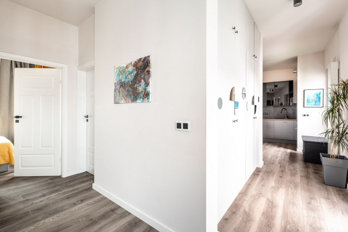 * przedpokoju z szafami wnękowymi na całej długości mieszkania,