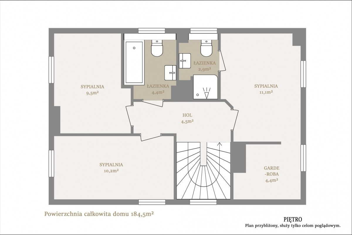 Na piętrze znajdują się 3 sypialnie w tym jedna sypialnia główna z łazienką i garderobą oraz dodatkowa osobna łazienka.