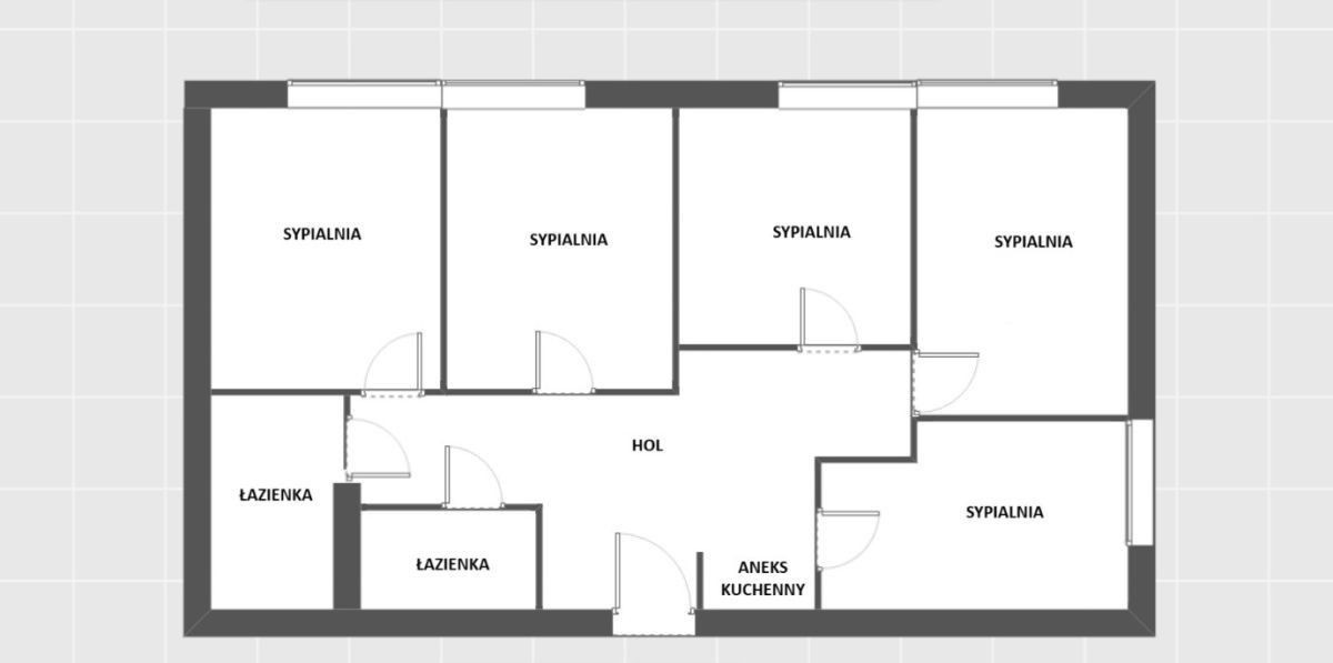 W ofercie znajdują się dwa poglądowe plany. Pierwszy z nich przedstawia obecny układ lokalu - 5 pokoi, drugi przedstawia układ pierwotny (salon z aneksem + 2 pokoje), do którego można po wyburzeniu ścianek działowych swobodnie powrócić. Plany mają charakter poglądowy, nie są to plany techniczne.