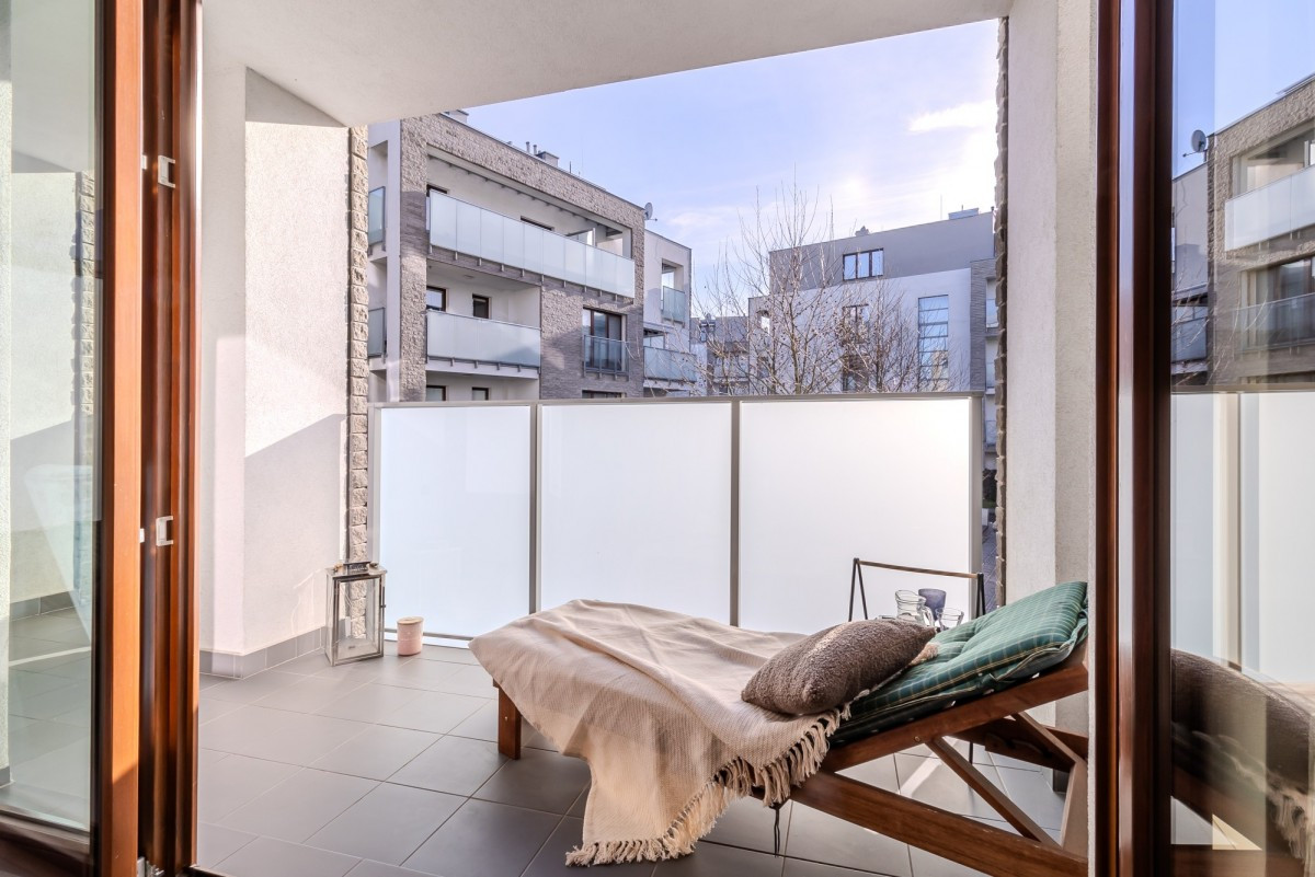 Przestronny taras z widokiem na zieloną część osiedla to idealne miejsce na chwile relaksu o każdej porze dnia. Rankiem możesz delektować się aromatyczną kawą w promieniach słońca, w ciągu dnia zrelaksować się z książką lub popracować w otoczeniu kojącej zieleni, a wieczorem odpocząć przy lampce wina, wsłuchując się w szum liści i śpiew ptaków. To przestrzeń stworzona zarówno do spokojnych, samotnych chwil, jak i spotkań w gronie bliskich, gdzie letnie wieczory nabierają wyjątkowego klimatu.