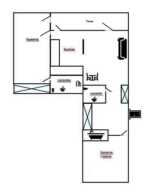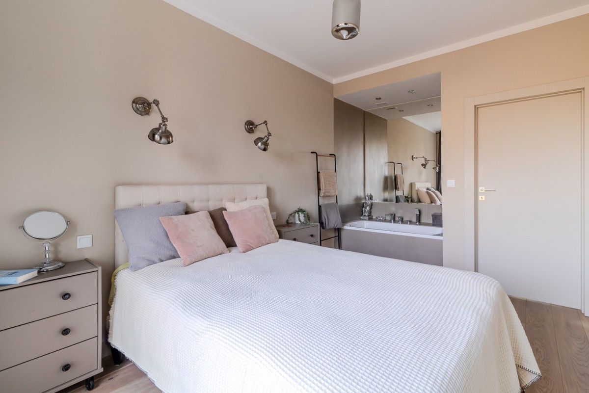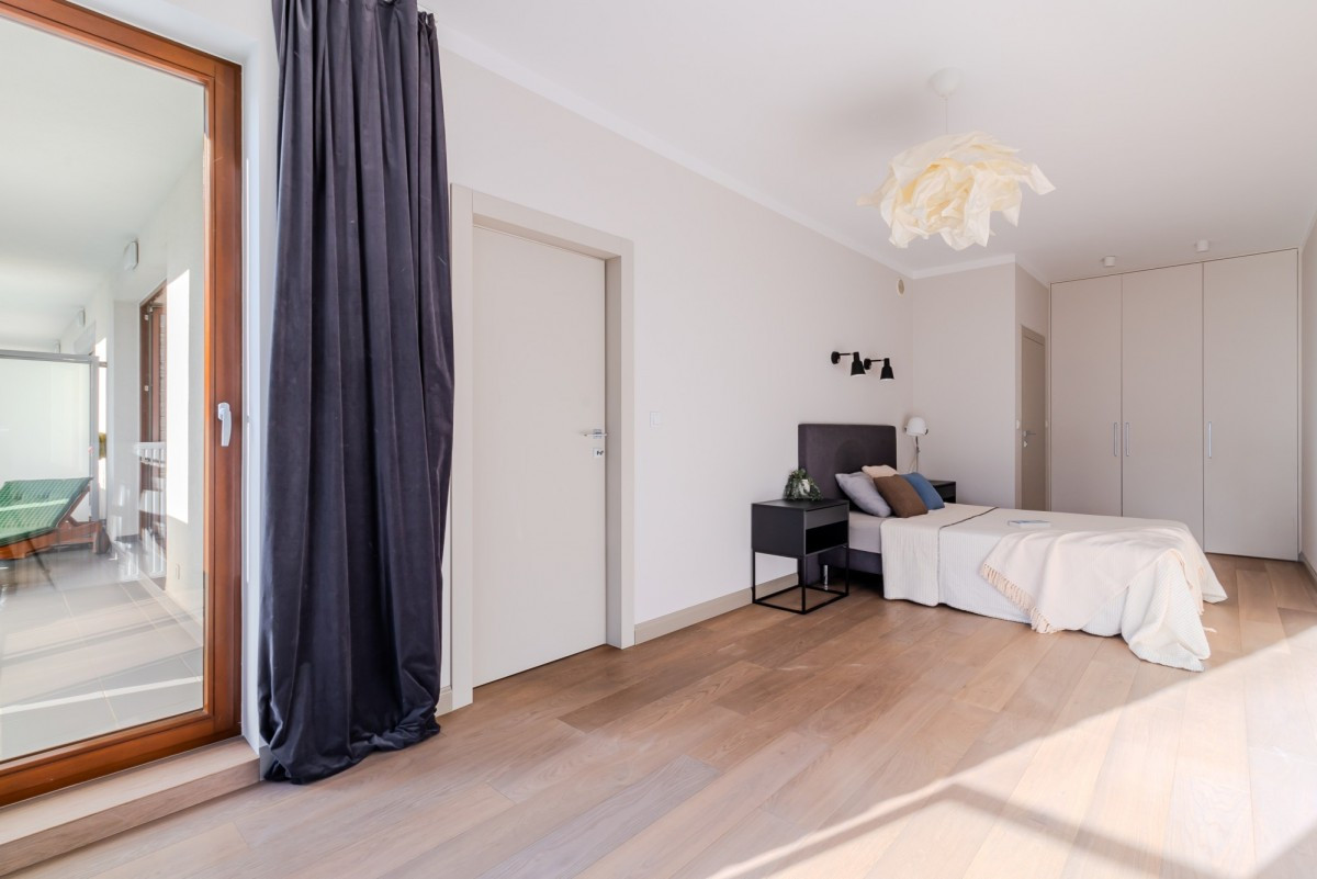Mieszkanie ma świetny rozkład - jest podzielone na centralną, przestronną część dzienną oraz 2 komfortowe sypialnie z łazienkami, na przeciwległych krańcach mieszkania. Umożliwia to bezproblemowe funkcjonowanie 2 niezależnych osób czy par , które mogą korzystać ze wspólnej kuchni, salonu i tarasu .