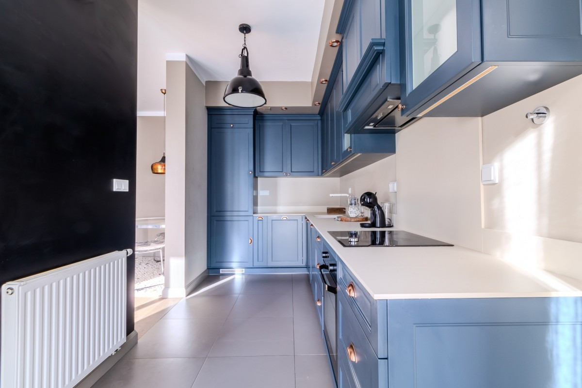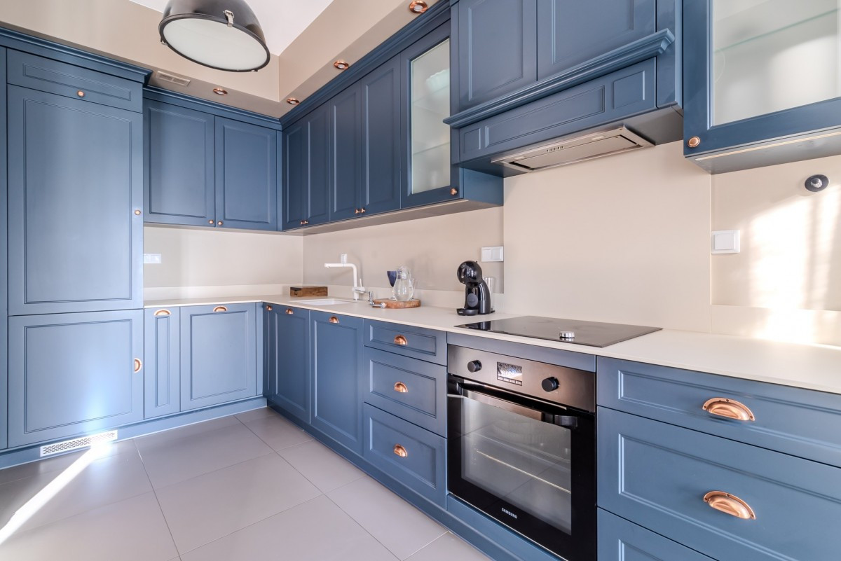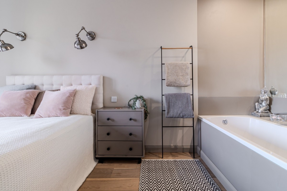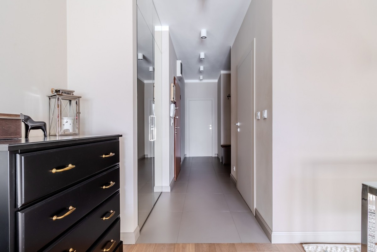 dużo zabudowanych szaf , panoramiczne, wysokie okna tworzące przyjemną i przytulną atmosferę w całym wnętrzu.