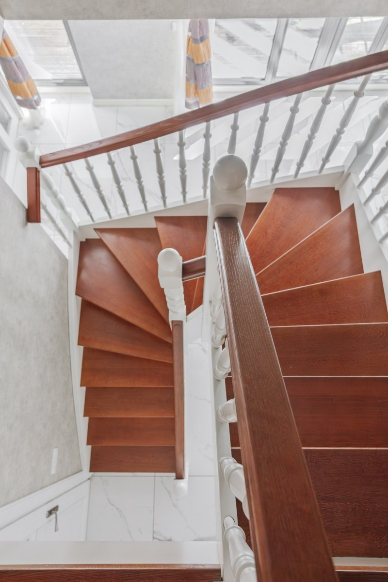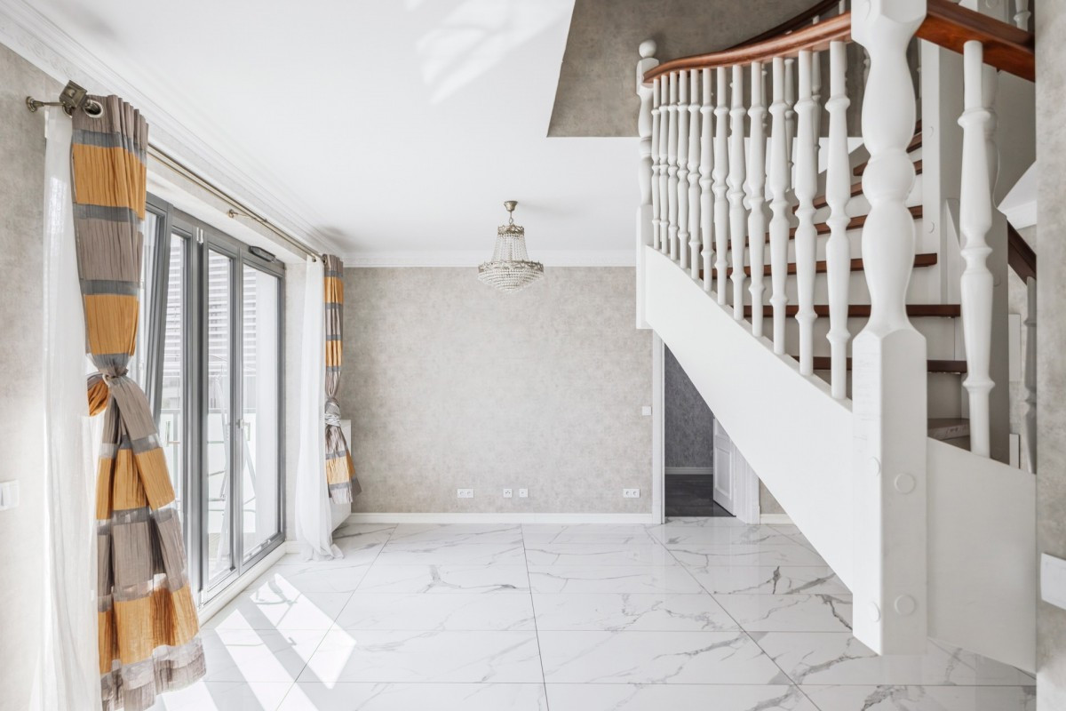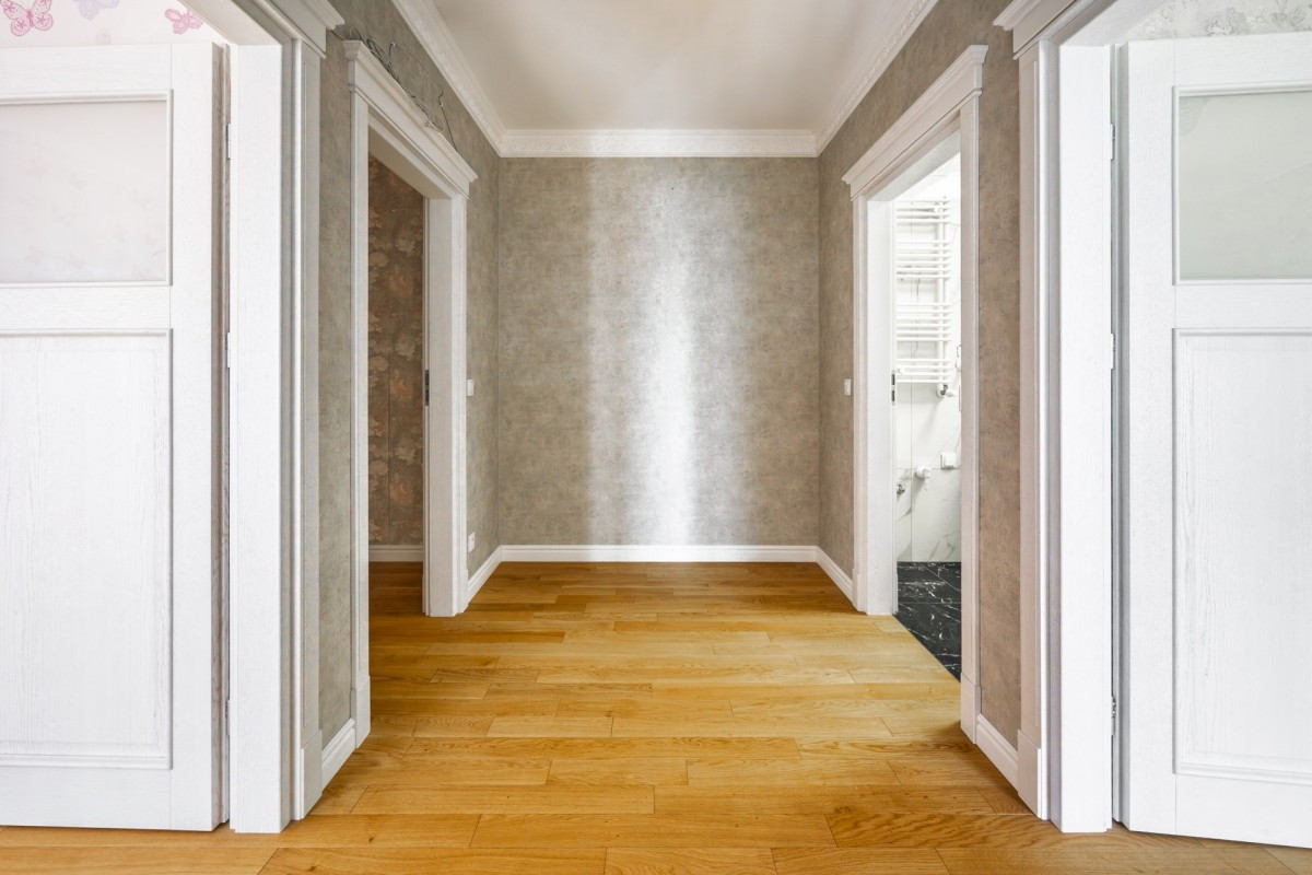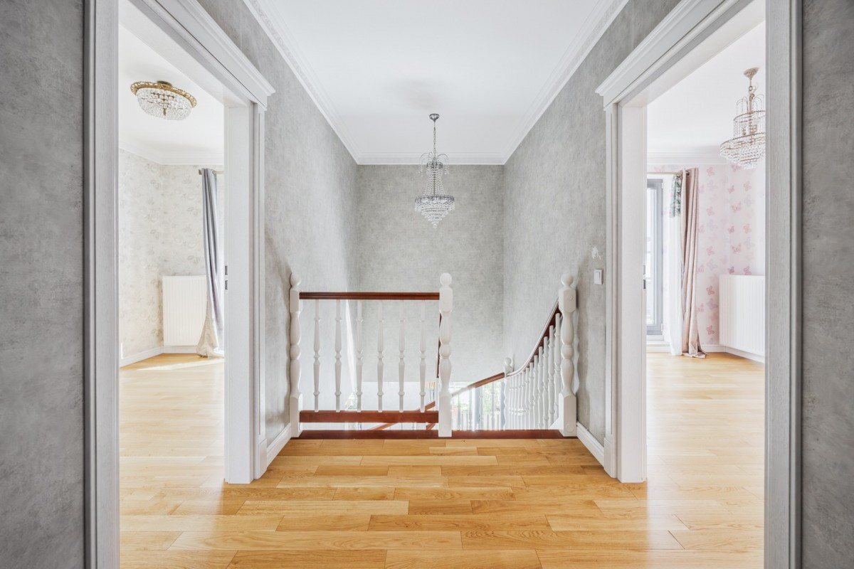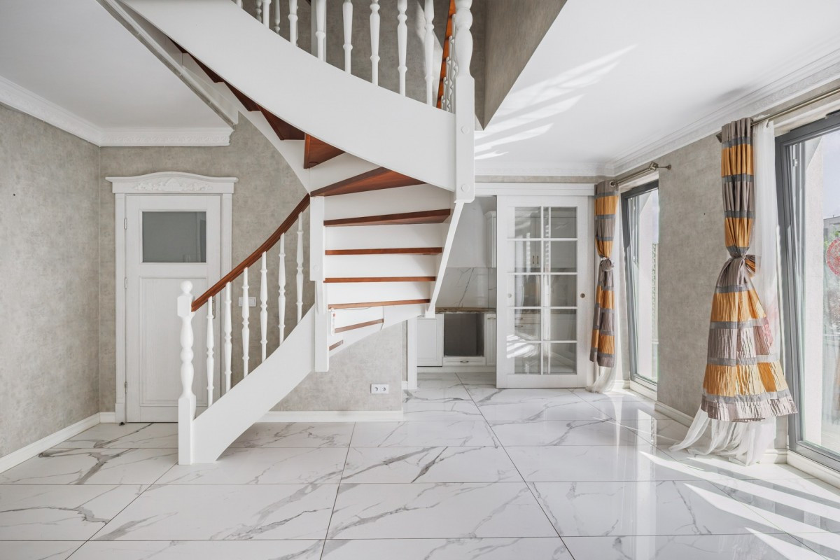 Apartament charakteryzuje się wysokim standardem wykończenia z dbałością o detale. Wykorzystano materiały wysokiej jakości, takie jak drewno (podłogi, schody, kuchnia) i kamień naturalny (blat kuchenny). Eleganckie sztukaterie dodają wnętrzu klasy. Klimatyzacja zapewnia komfort termiczny przez cały rok. Wysokość pomieszczeń (ok. 265 cm) potęguje wrażenie przestronności.