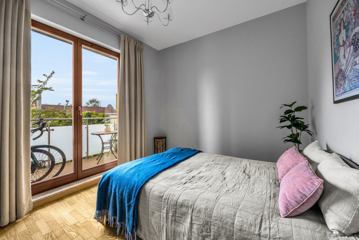 Wartymi podkreślenia zaletami apartamentu są duże, drewniane okna, wysokie pomieszczenia (3 metry wysokości), przestronna garderoba, balkon z widokiem na zieleń, a także drewniany parkiet położony we wszystkich pomieszczeniach.