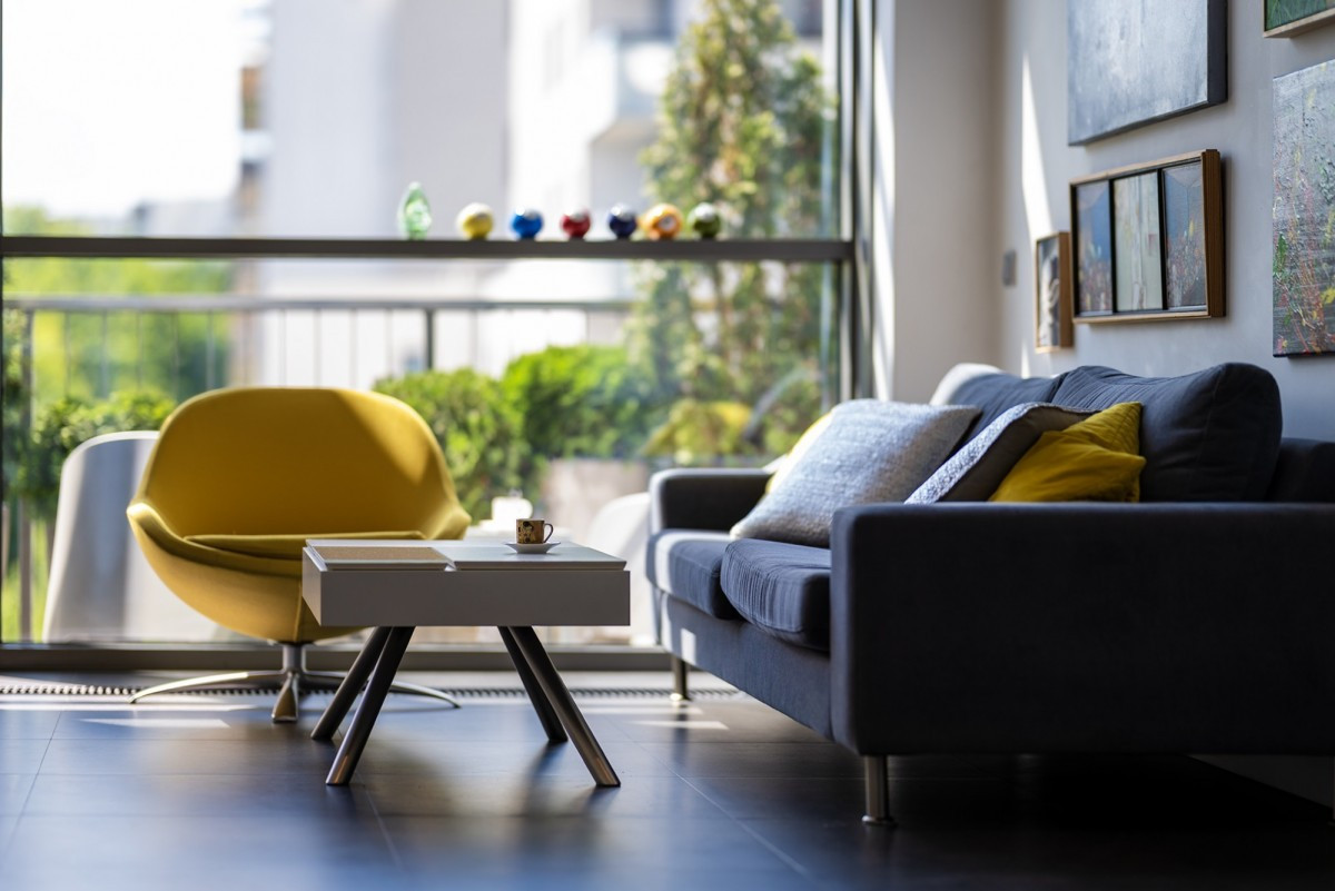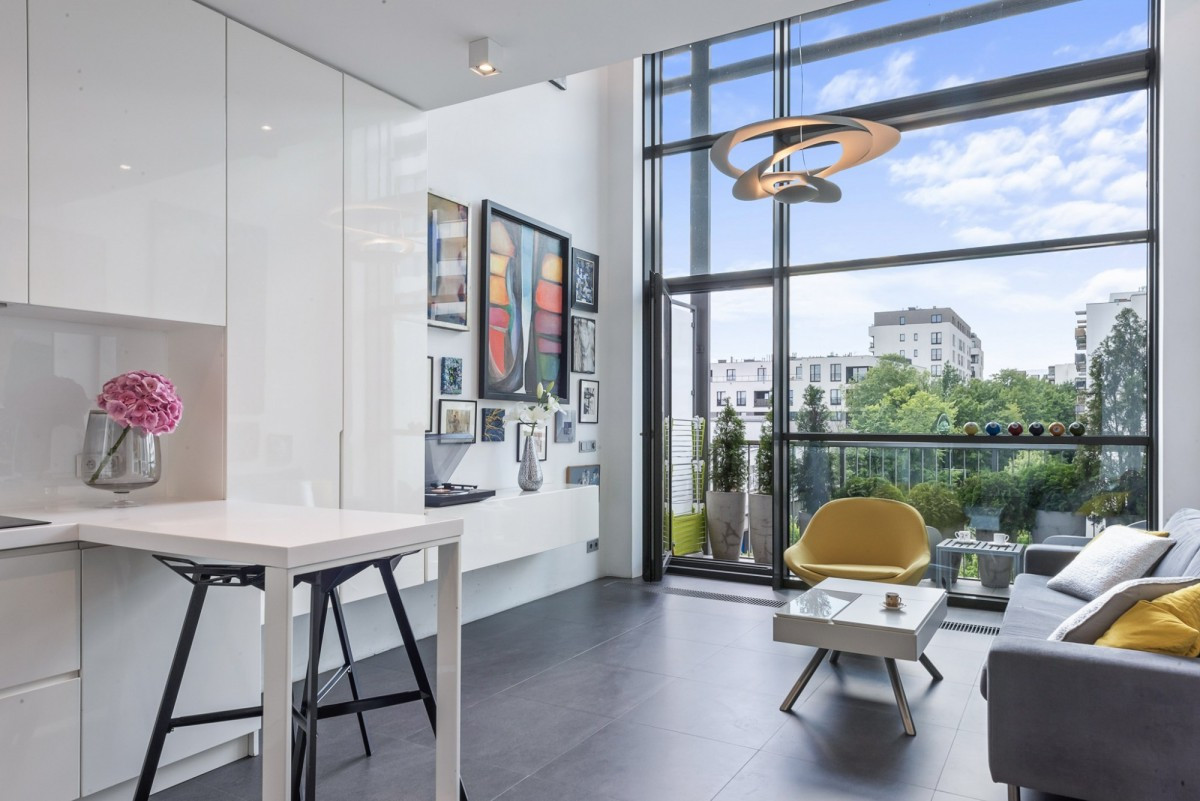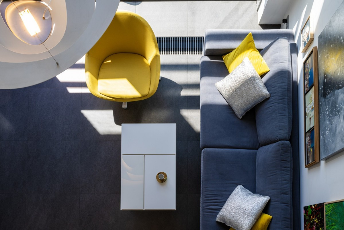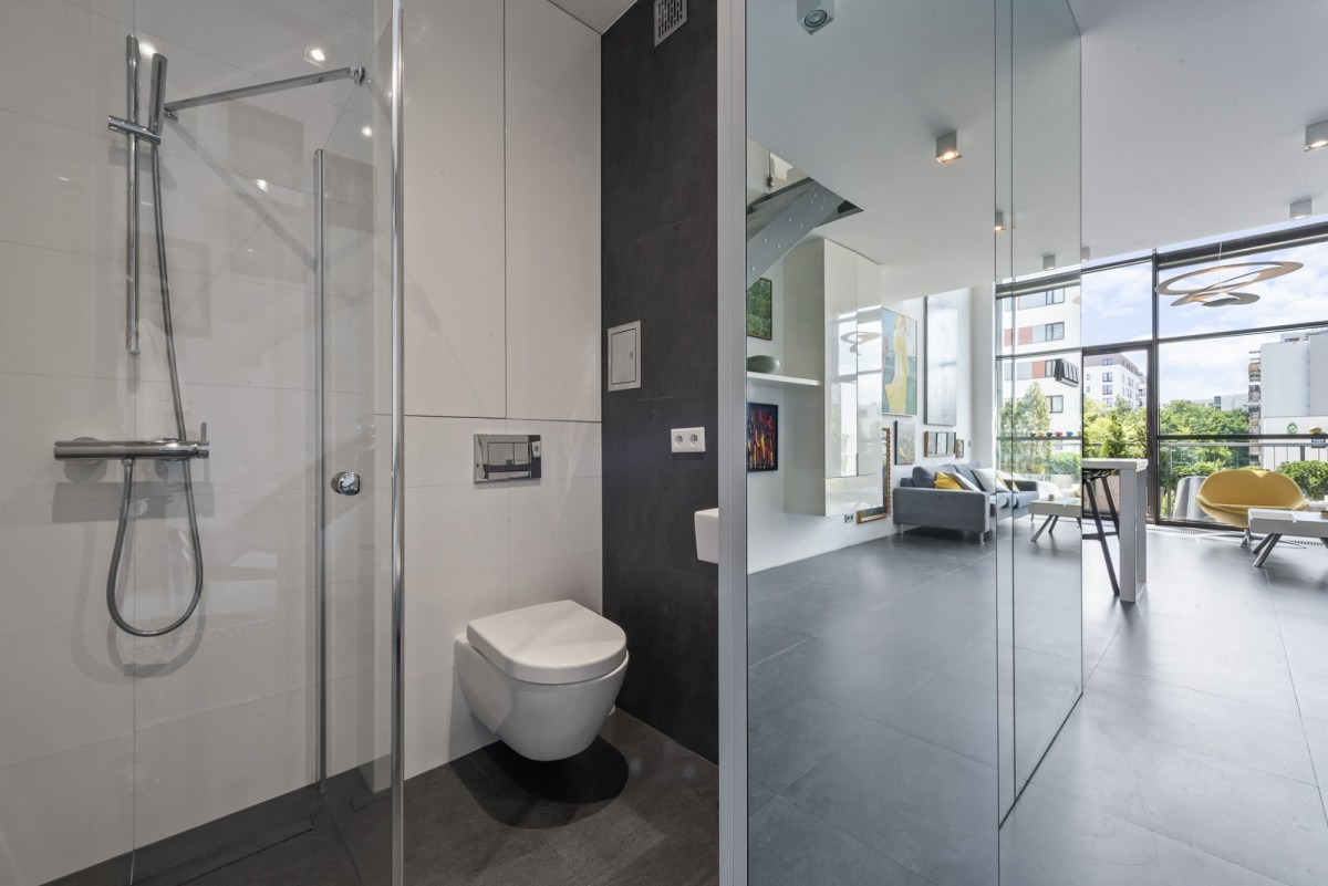Mieszkanie ma charakter loftu o powierzchni 66 m kwadratowych i podzielono je na dwa funkcjonale poziomy z przeznaczeniem na strefy dzienną i prywatną.