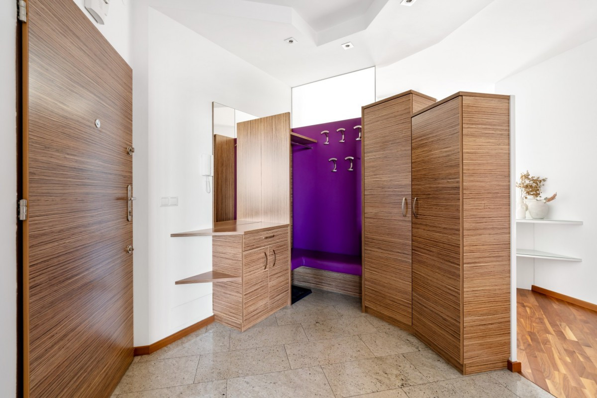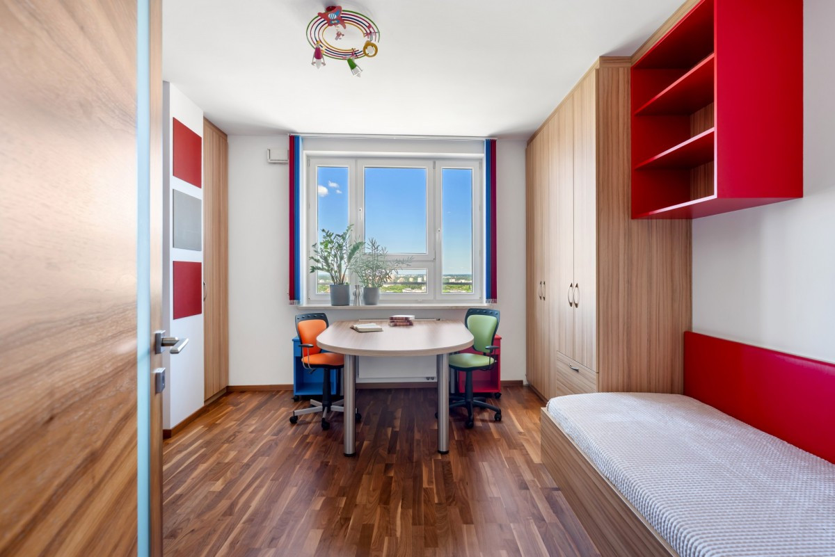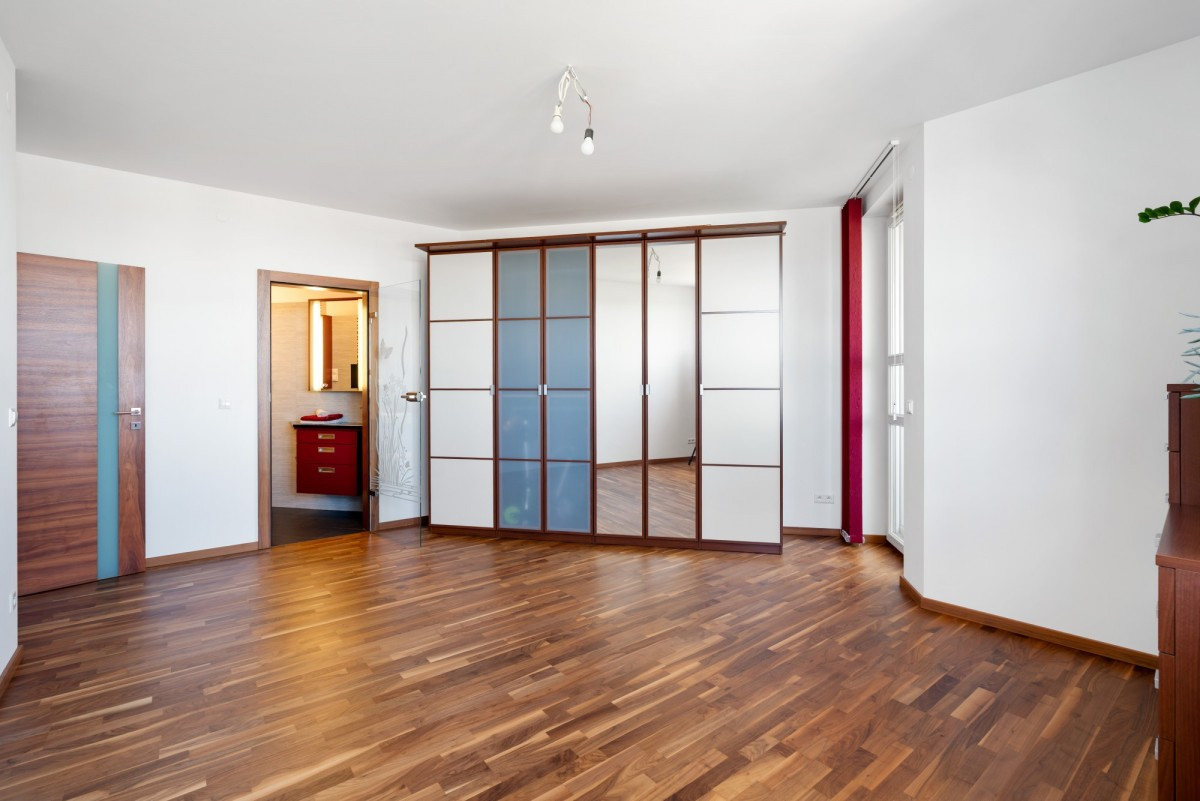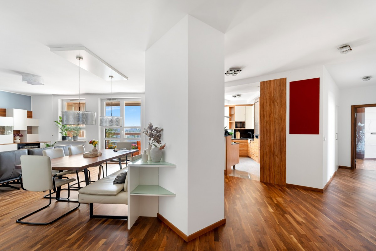 Mieszkanie jest dwustronne - z salonu rozciąga się zachwycająca panorama Warszawy i „warszawskiego city”, natomiast z sypialni i gabinetu widok na zielony Stary Żoliborz.