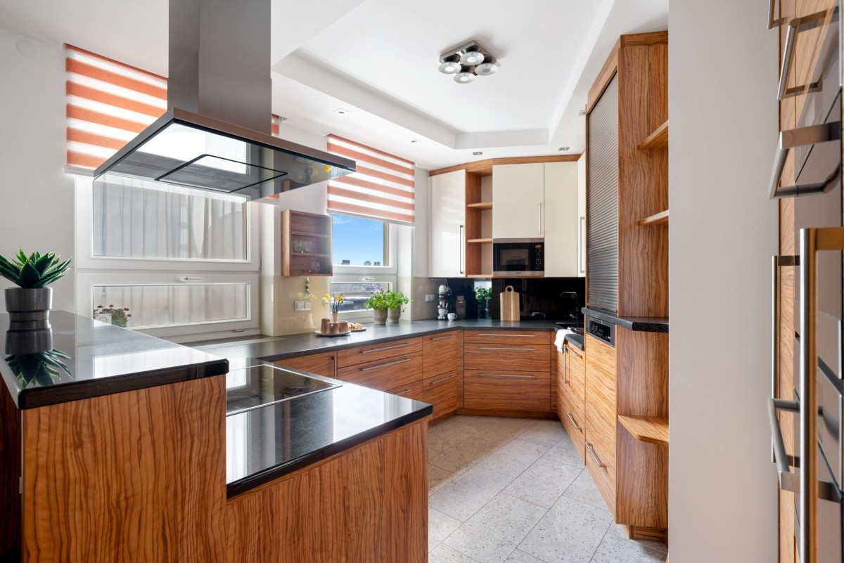 Otwarta, jasna kuchnia z dwoma oknami, w pełni wyposażona
