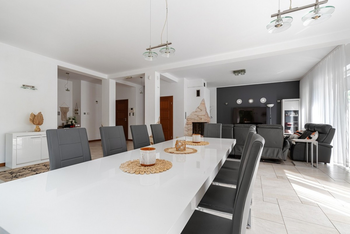 Salon z kominkiem o powierzchni 55,5 mkw. z wyjściem na duży taras.
