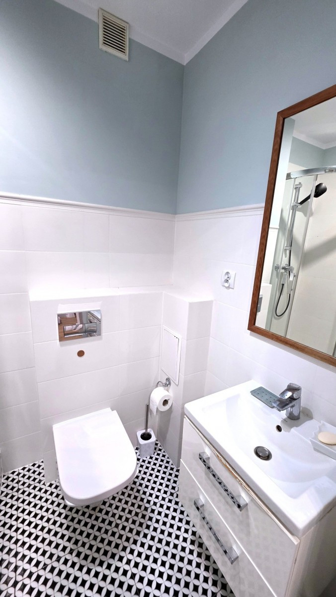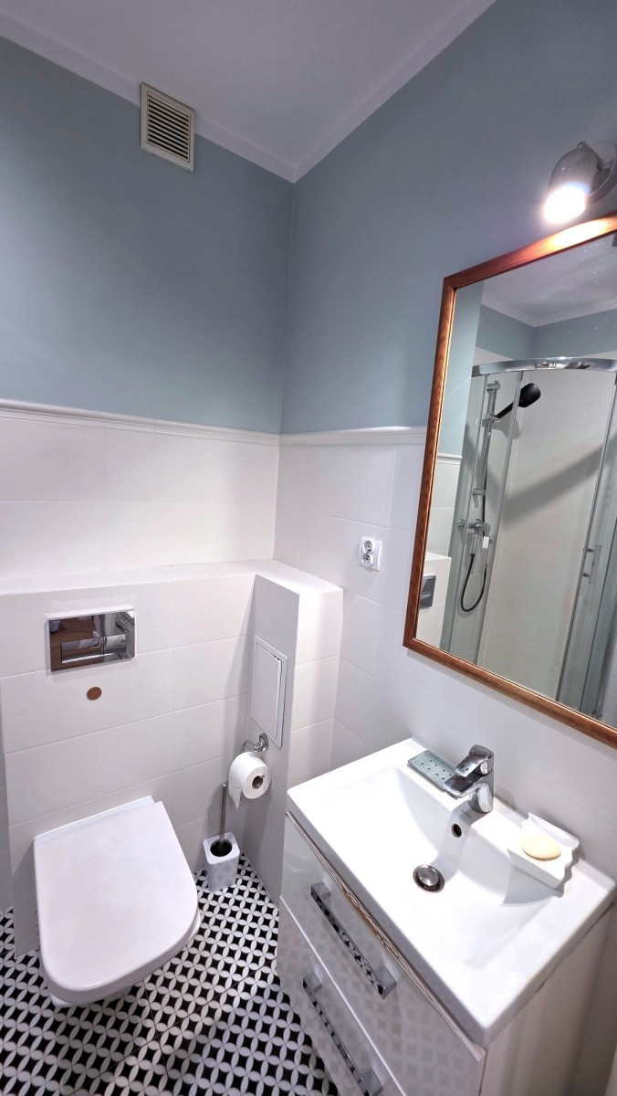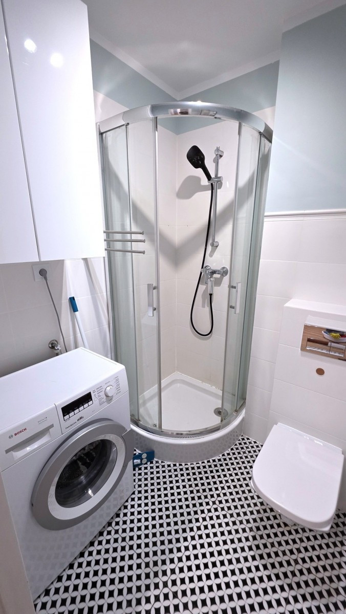 - łazienki z kabiną prysznicową, toaletę, pralkę, umywalkę z lustrem,