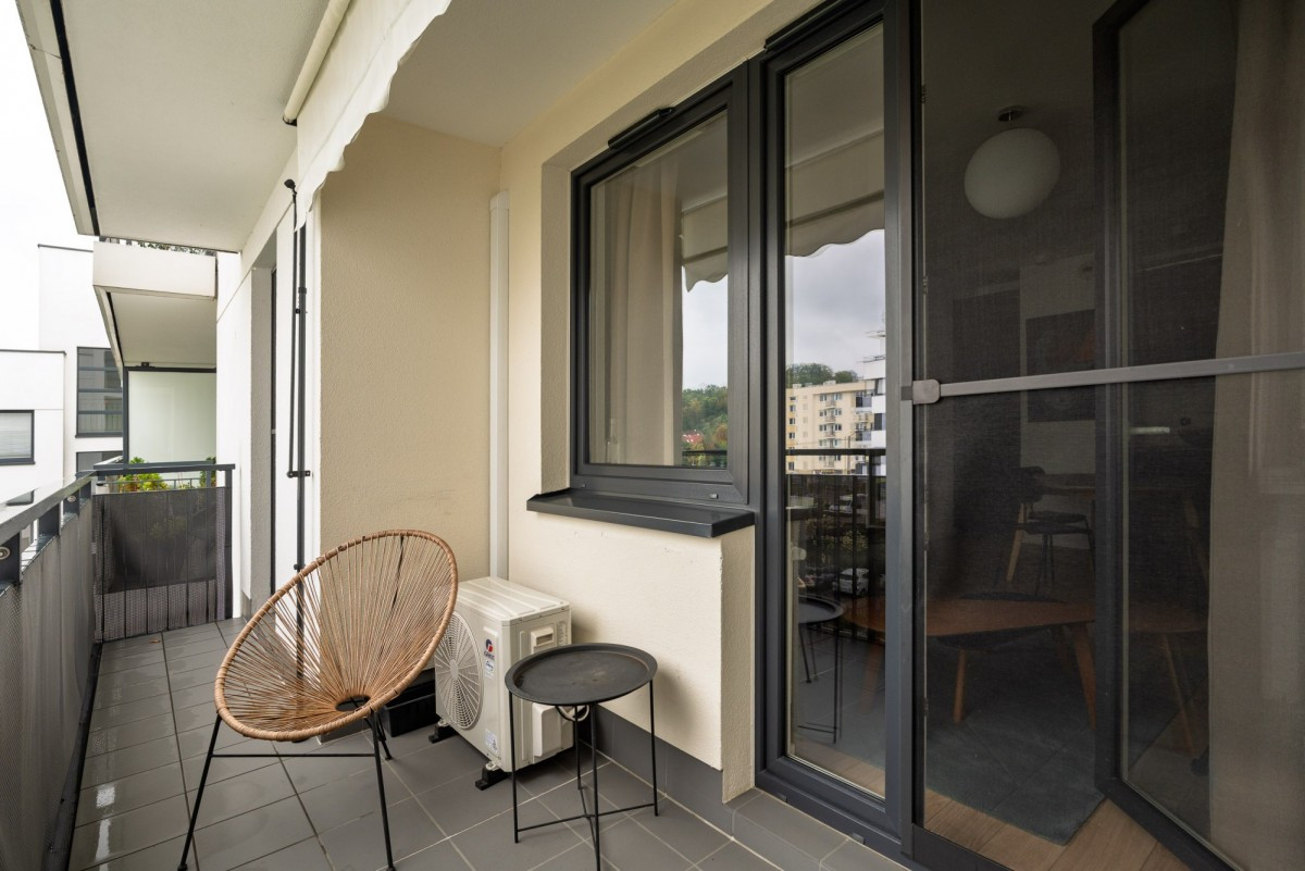 Wykończony z dbałością o każdy detal, został wyposażony w klimatyzację, w pełni umeblowany oraz zaopatrzony w telewizor, zmywarkę, pralko-suszarkę, czajnik elektryczny, żelazko i odkurzacz. Mieszkanie jest gotowe do wprowadzenia się od zaraz.