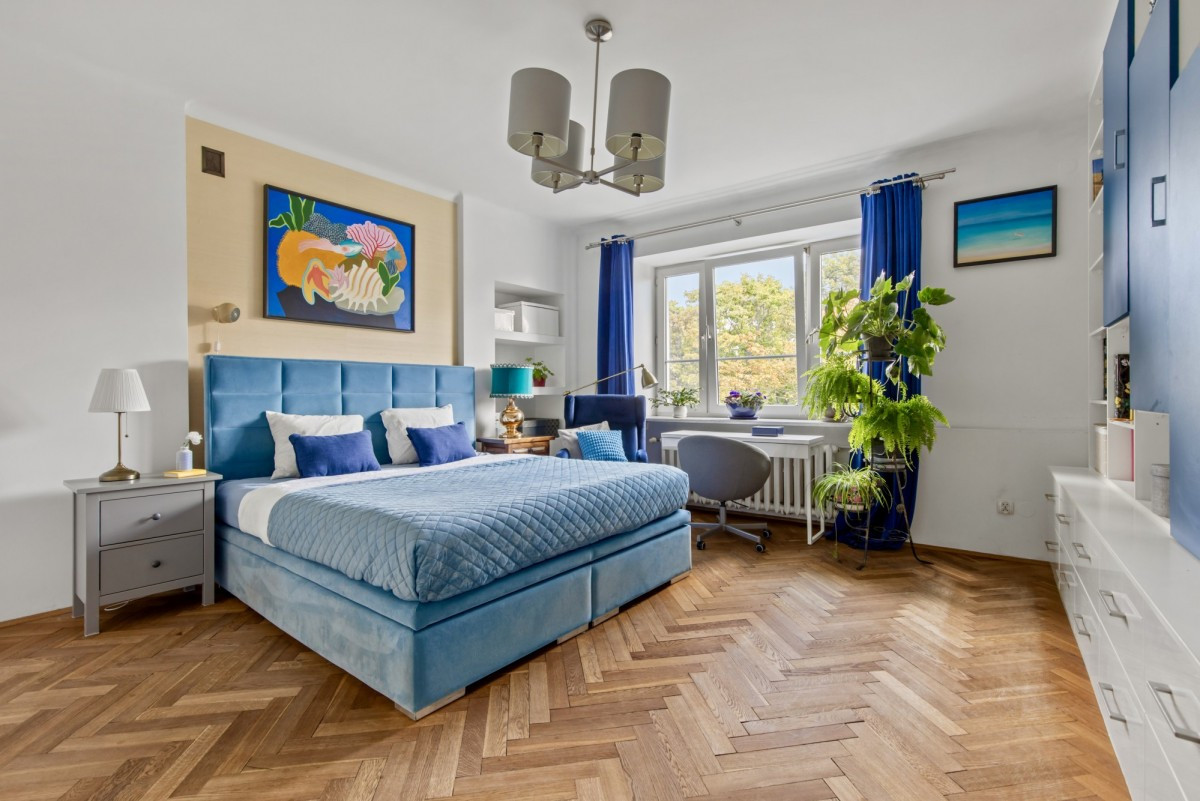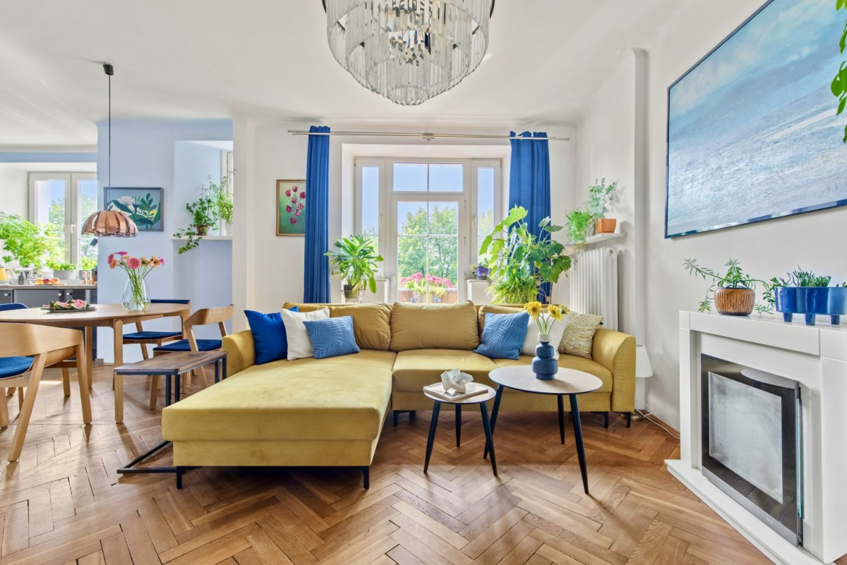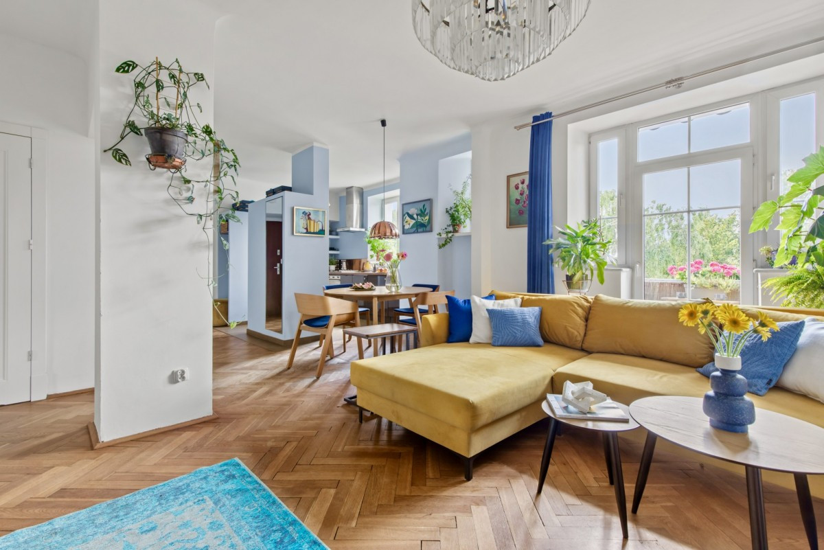 Zalety tej nieruchomości można wymieniać bardzo długo. To między innymi piękny drewniany parkiet, wysokie, charakterystyczne dla kamienicy sufity, barwne wnętrza, salon z kominkiem, balkon z widokiem na ogród.