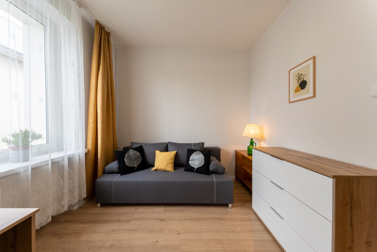 • Stylowy salon z dużym stołem, wygodną rozkładaną kanapą i dostępem do balkonu
