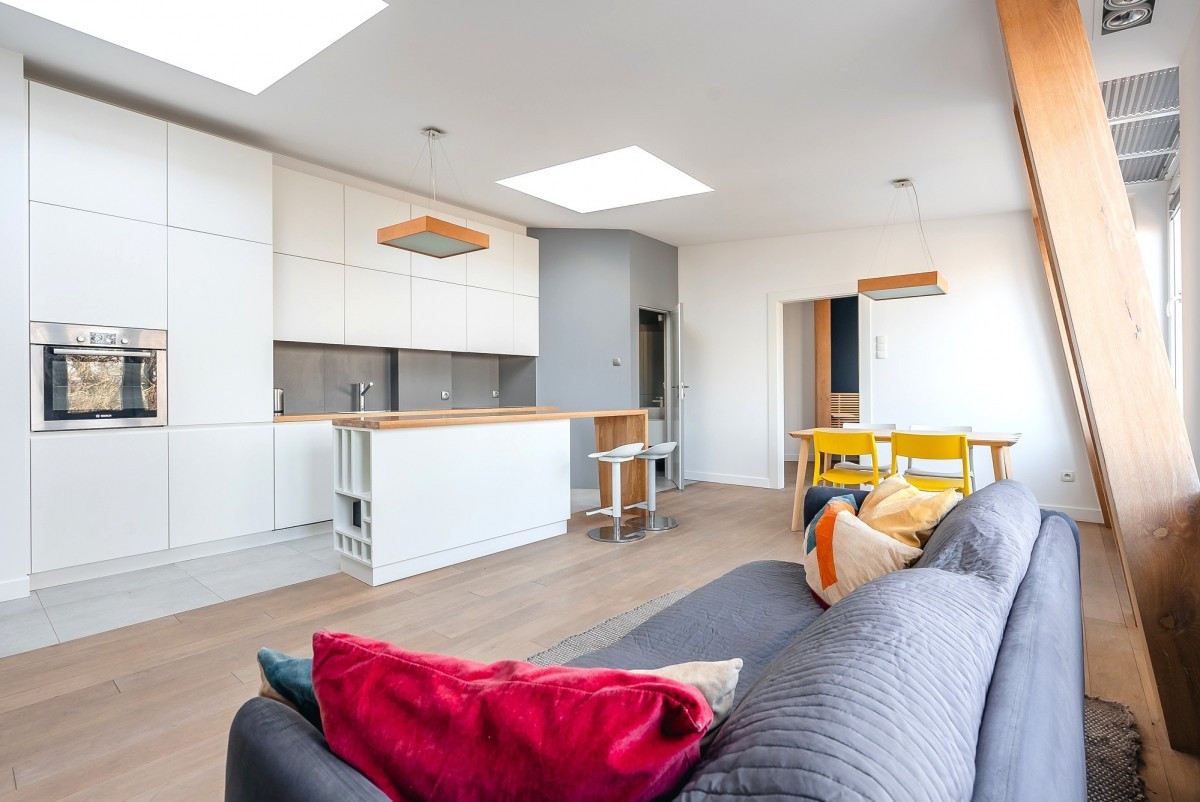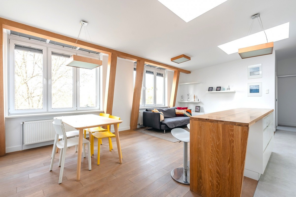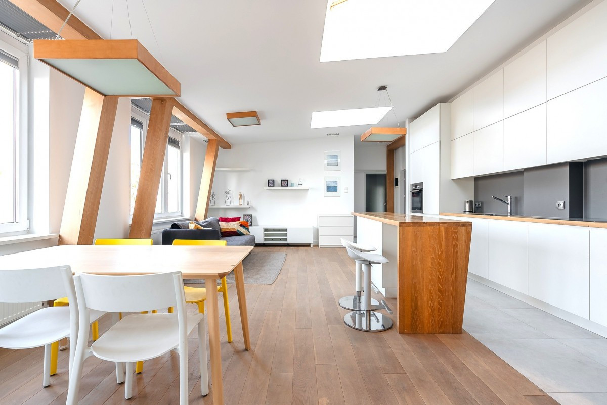 Projekt apartamentu wykonany przez architekta, obejmuje przestronne wejście i duże otwarte przestrzenie. Wysokość do sufitów i wykończenie drewnianymi belkami nośnymi dodaje mu lekkości.