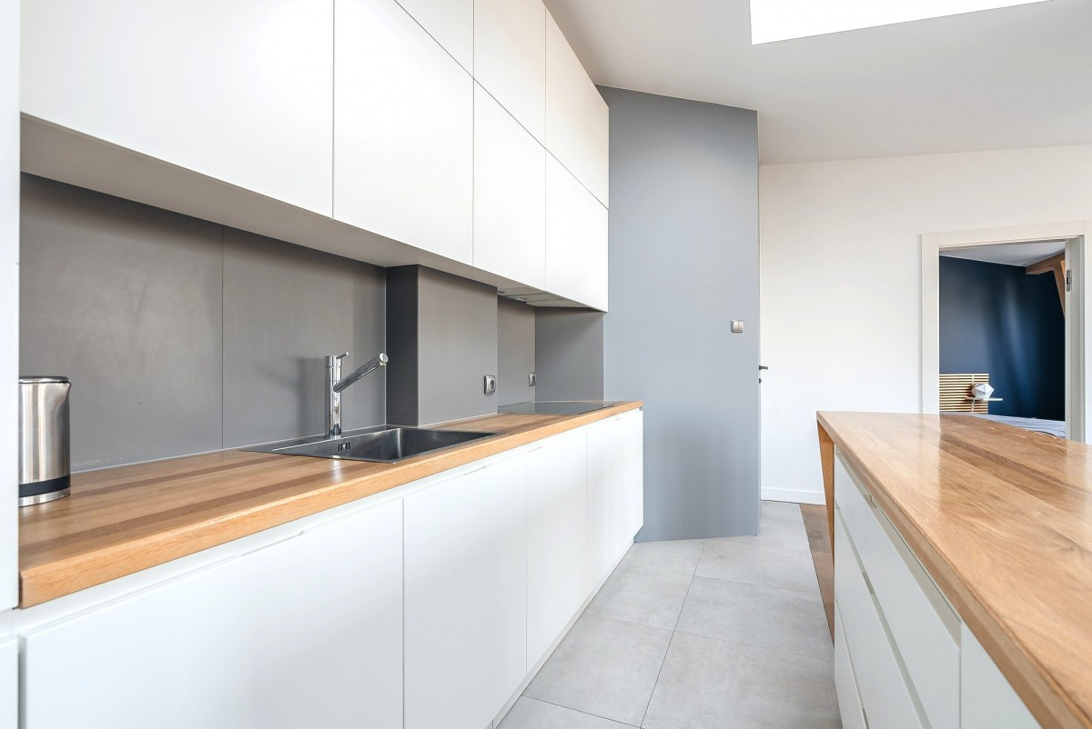 W pełni wyposażona kuchnia (lodówka z zamrażarką, pralka z suszarką, kuchenka indukcyjna, piekarnik, zmywarka, ekspres do kawy), oddzielona od części dziennej wyspą roboczą z pięknym drewnianym blatem