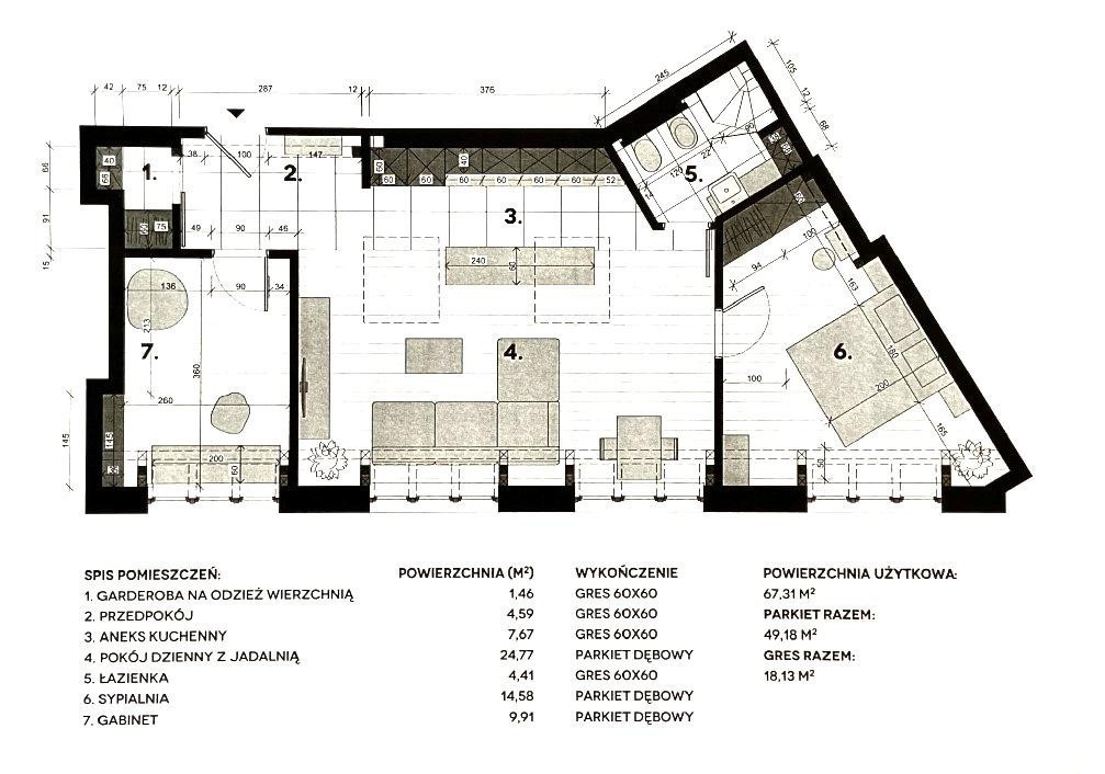 Apartament składa się z pokoju dziennego z jadalnią (24,77 m2) połączonego z aneksem kuchennym (7,67 m2) , sypialni (14,58 m2), gabinetu (9,91 m2), łazienki (4,41 m2), przedpokoju (4,59 m2) oraz garderoby na odzież wierzchnią (1,46 m2).