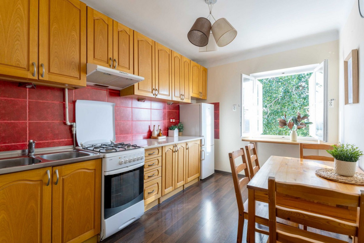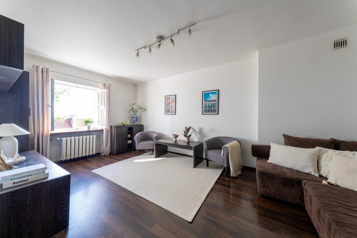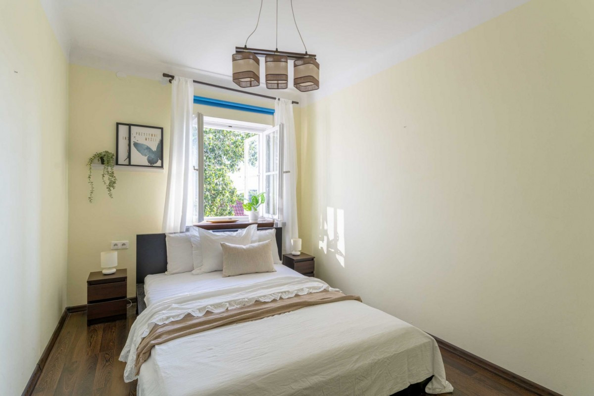 Stare Miasto to miejsce, gdzie czas płynie inaczej. Kamienne uliczki szepczą dawne legendy, a każdy zakamarek skrywa swoją tajemnicę. Wśród tych historycznych zakątków, przy cichej i urokliwej uliczce Krzywe Koło stoi zabytkowa kamienica, która odbudowana w 1953 roku, niczym feniks powstała z popiołów wojny, by zachwycać na nowo. Dziś miejsce to oczarowuje swoim spokojem i niezwykłą aurą, jakiej nie znajdziesz nigdzie indziej. To właśnie tu, na trzecim piętrze z bajecznym widokiem ze szczytu skarpy, znajduje się kameralne mieszkanie, które jak opowieść jest niepowtarzalne, pełne magii i światła.