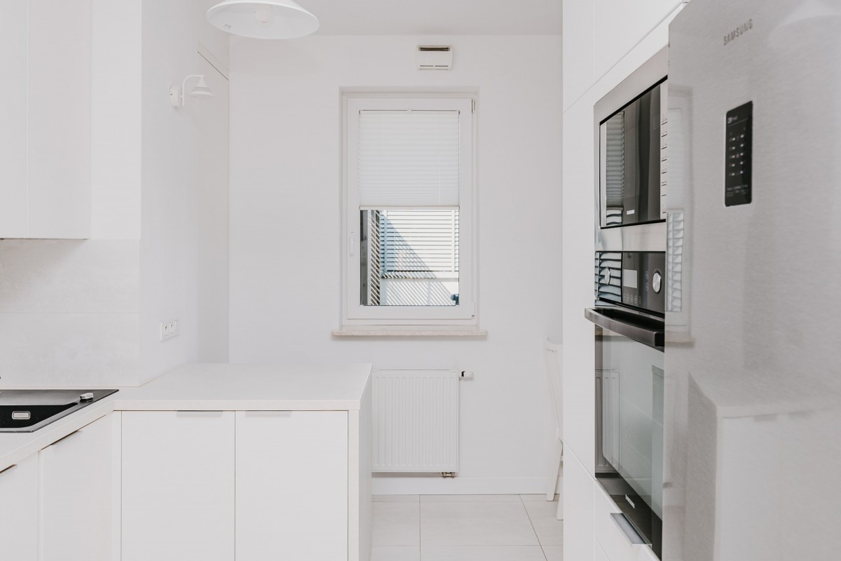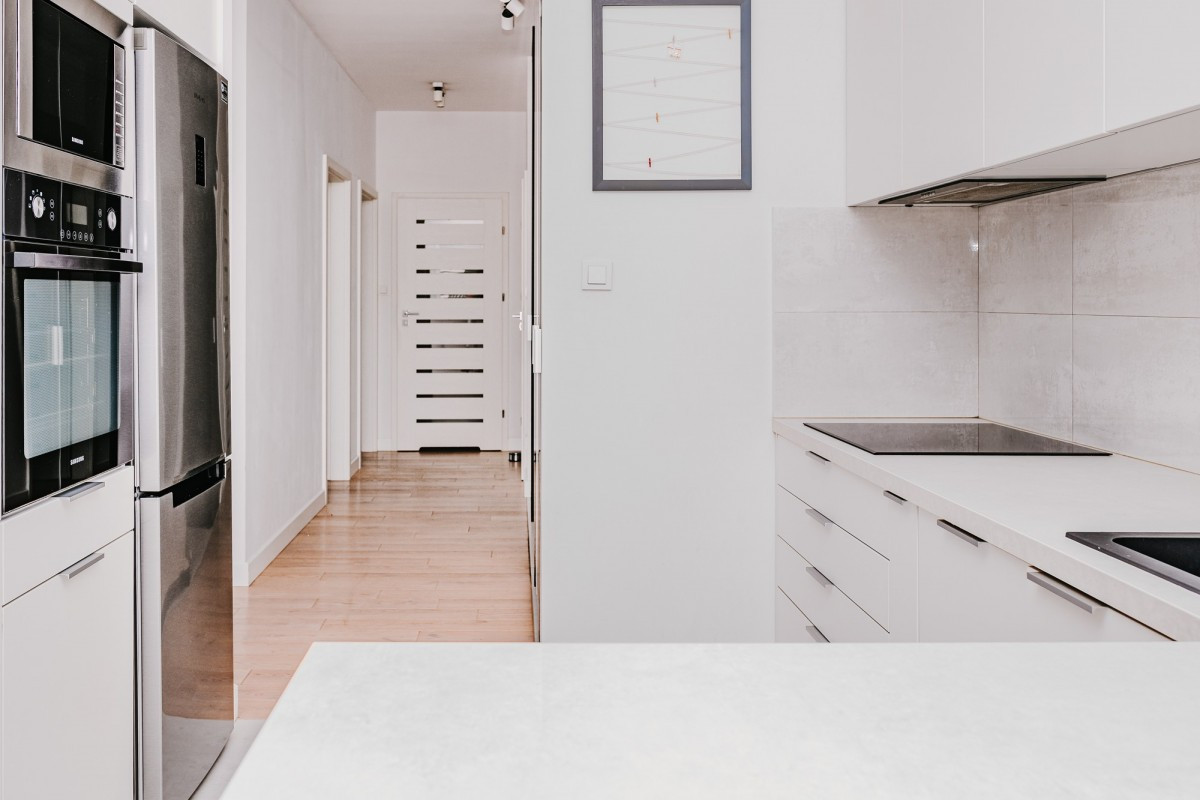 Kuchnia: nowoczesna, meble na wymiar z wysokiej jakości sprzętem AGD (płyta indukcyjna, zmywarka, duża lodówka, piekarnik elektryczny, mikrofalówka)