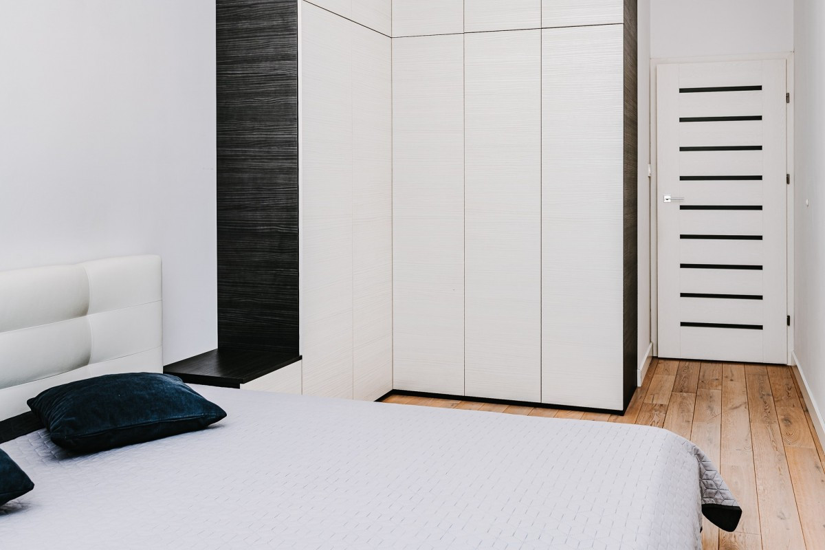 Sypialnie: główna z dużym łóżkiem 1,6x2m i szafami, mniejsza z sofą, biurkiem i pojemną szafą