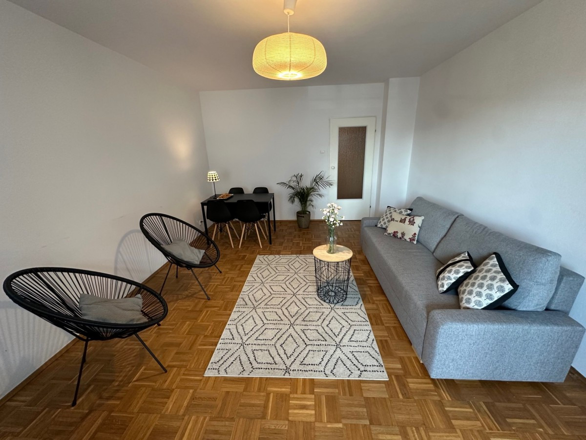 - Przytulnego salonu z dużą kanapą, dwoma fotelami, szafką RTV z telewizorem oraz stołu jadalnianego z kompletem krzeseł.
