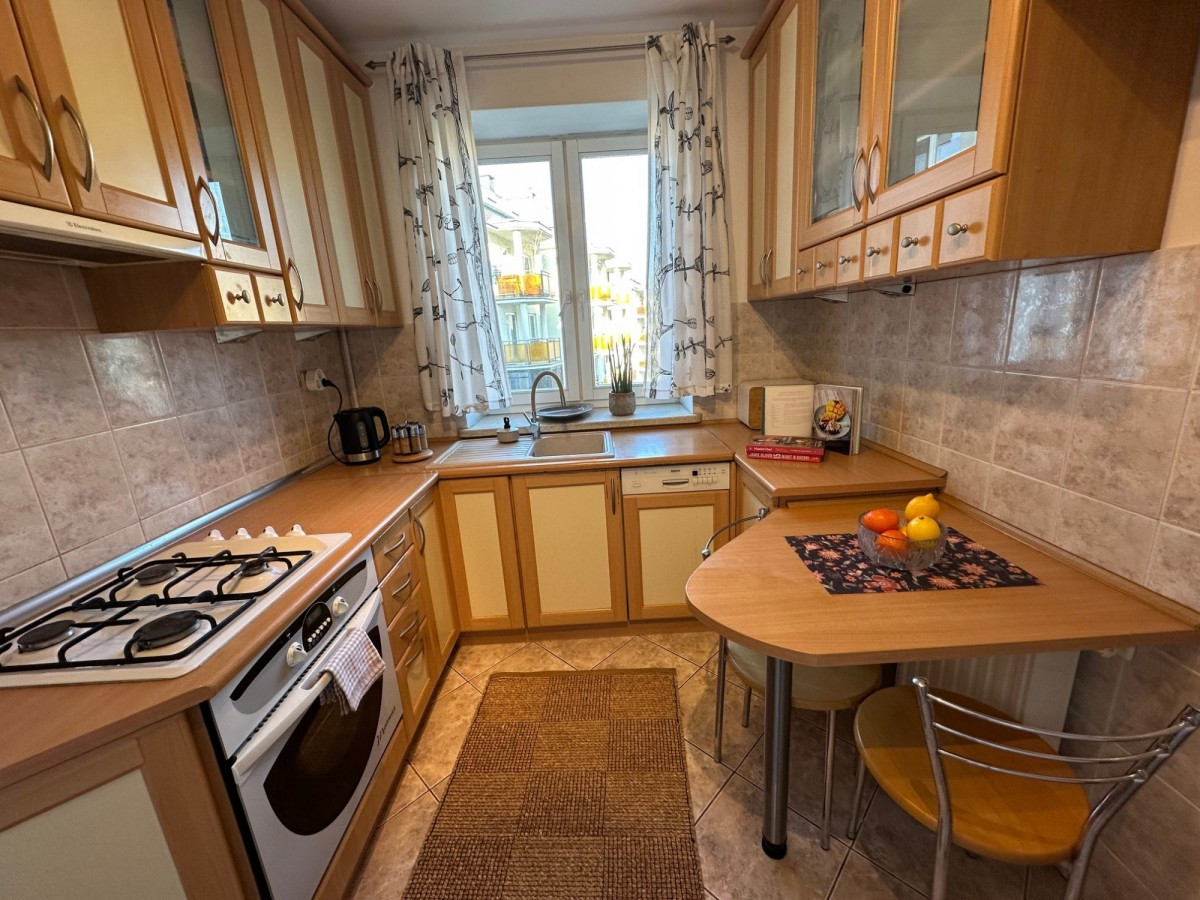 - Oddzielnej, widnej kuchni z podwójnym oknem, w pełni wyposażonej w sprzęt AGD (lodówka, zamrażalnik, kuchenka gazowa, zmywarka, okap, czajnik, talerze, garnki, przybory kuchenne) oraz stolikiem z dwoma krzesłami. Duża ilość szafek zapewnia wiele miejsca do przechowywania.