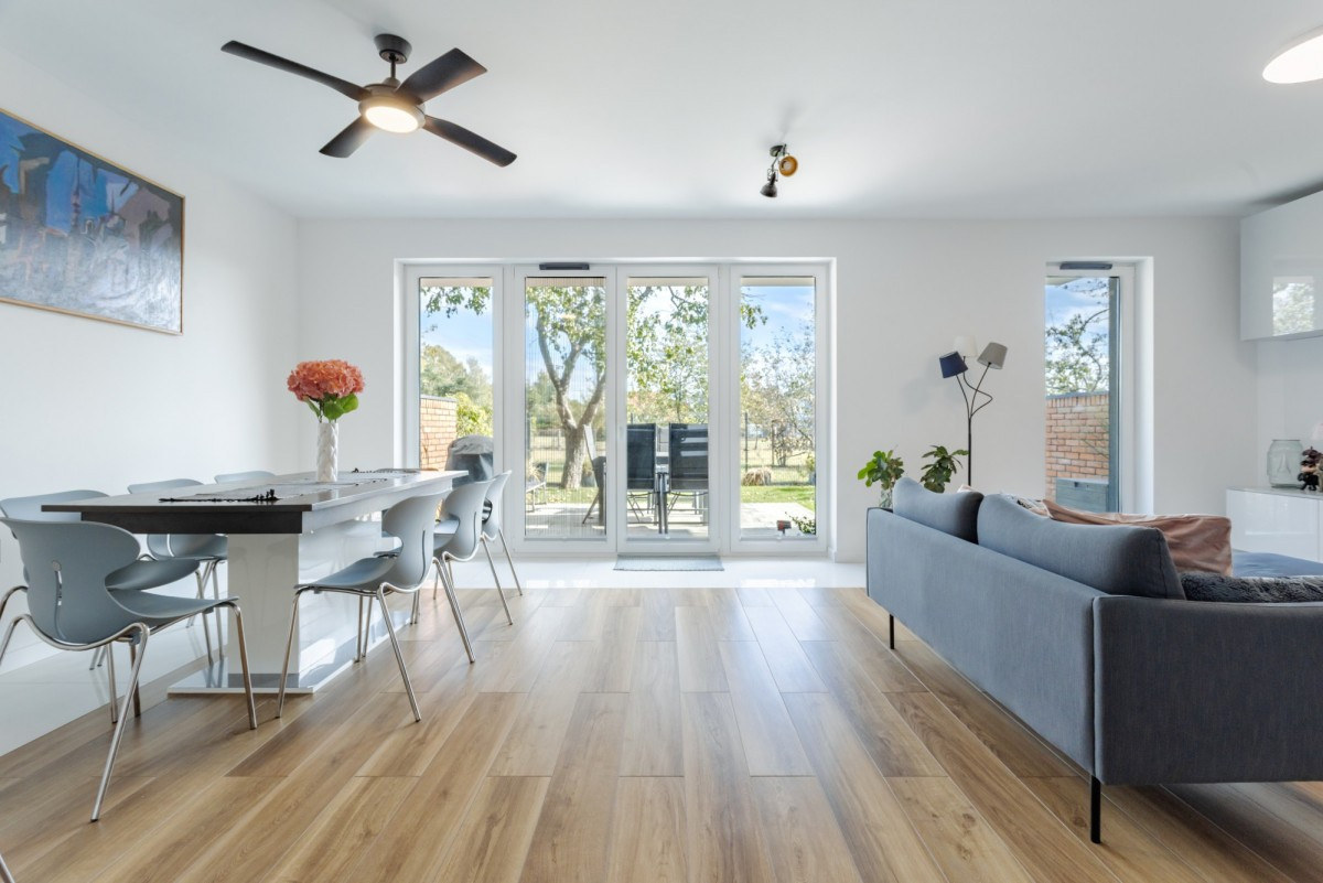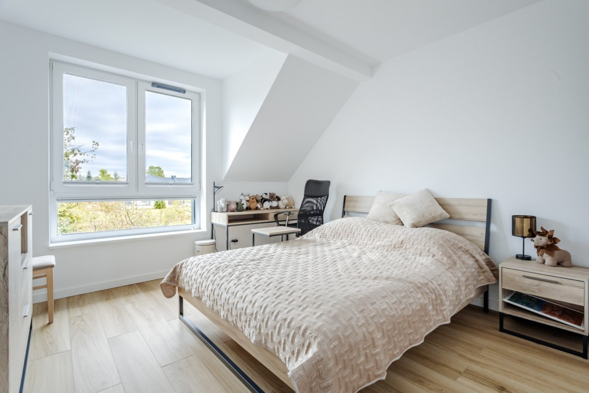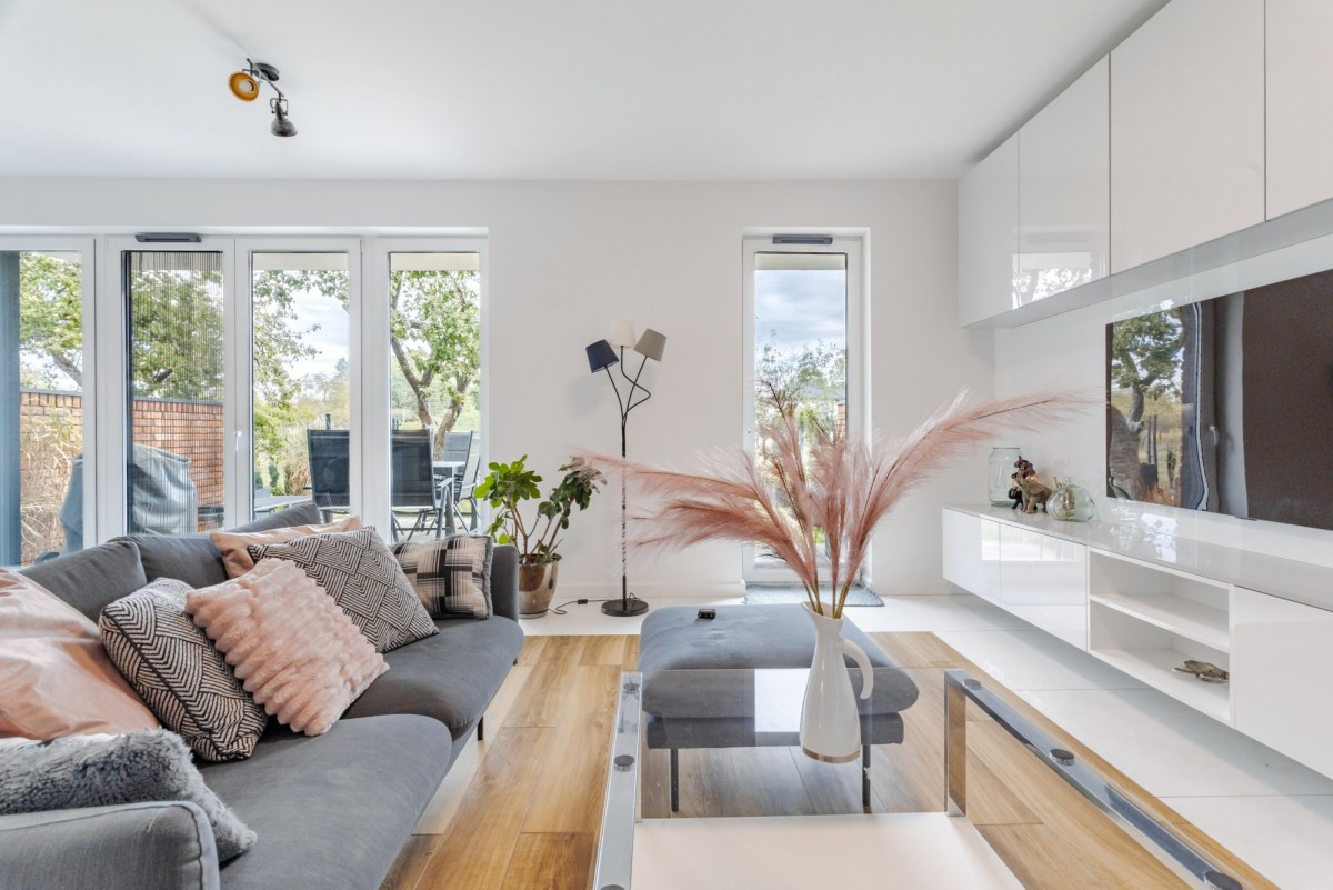 Na parterze znajduje się przestronny salon z aneksem kuchennym (44,6 m²) i jadalnią z bezpośrednim wyjściem do ogrodu od strony wschodniej. Duże przeszklenia wypełniają wnętrze naturalnym światłem od rana, tworząc przytulną i harmonijną przestrzeń.