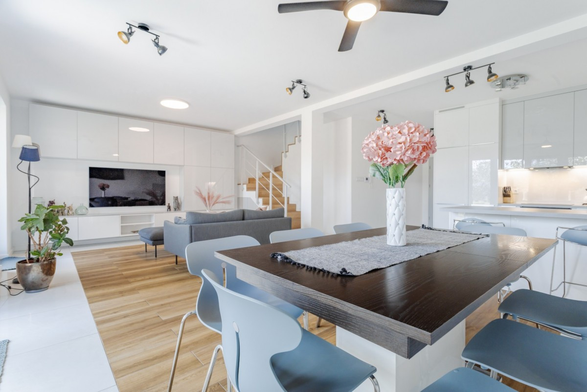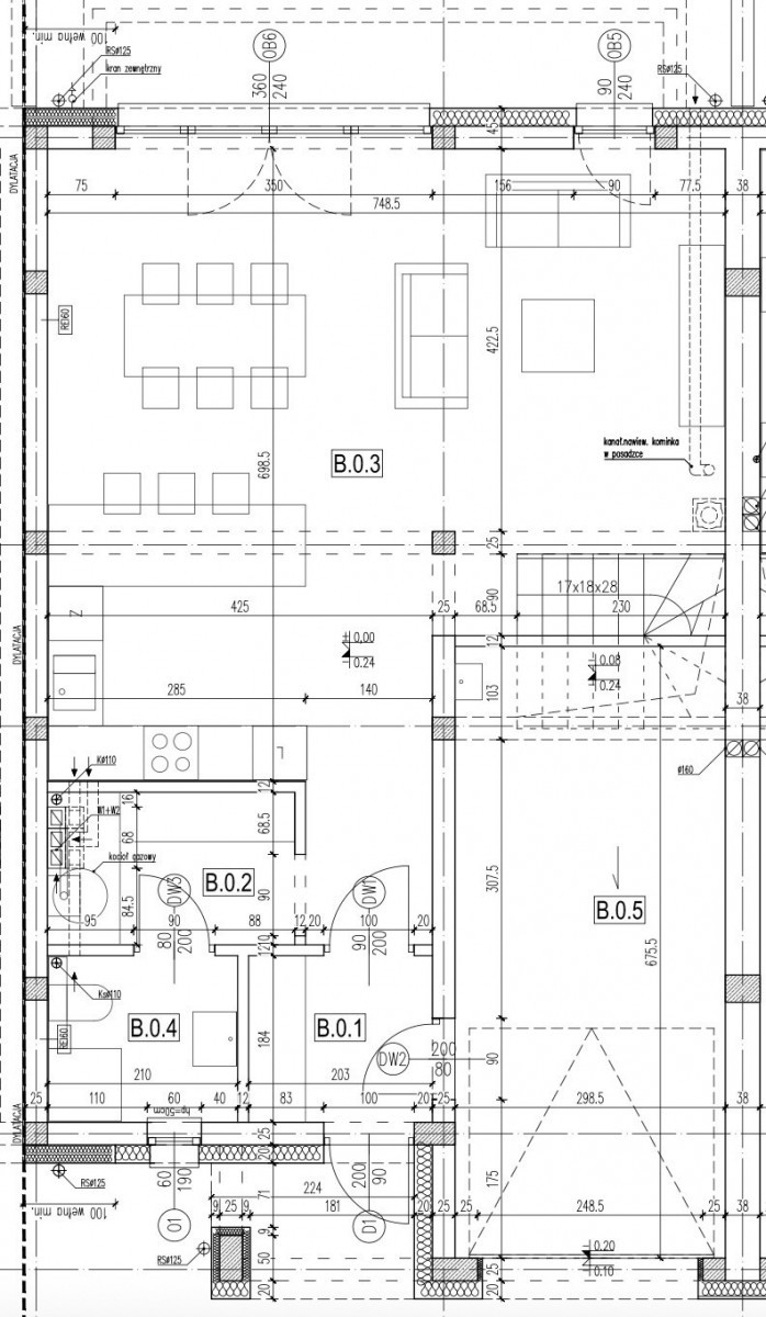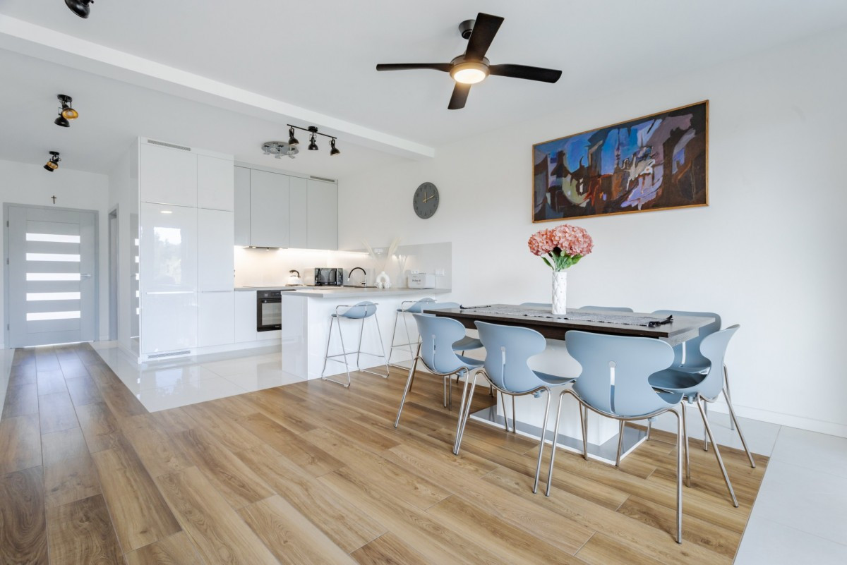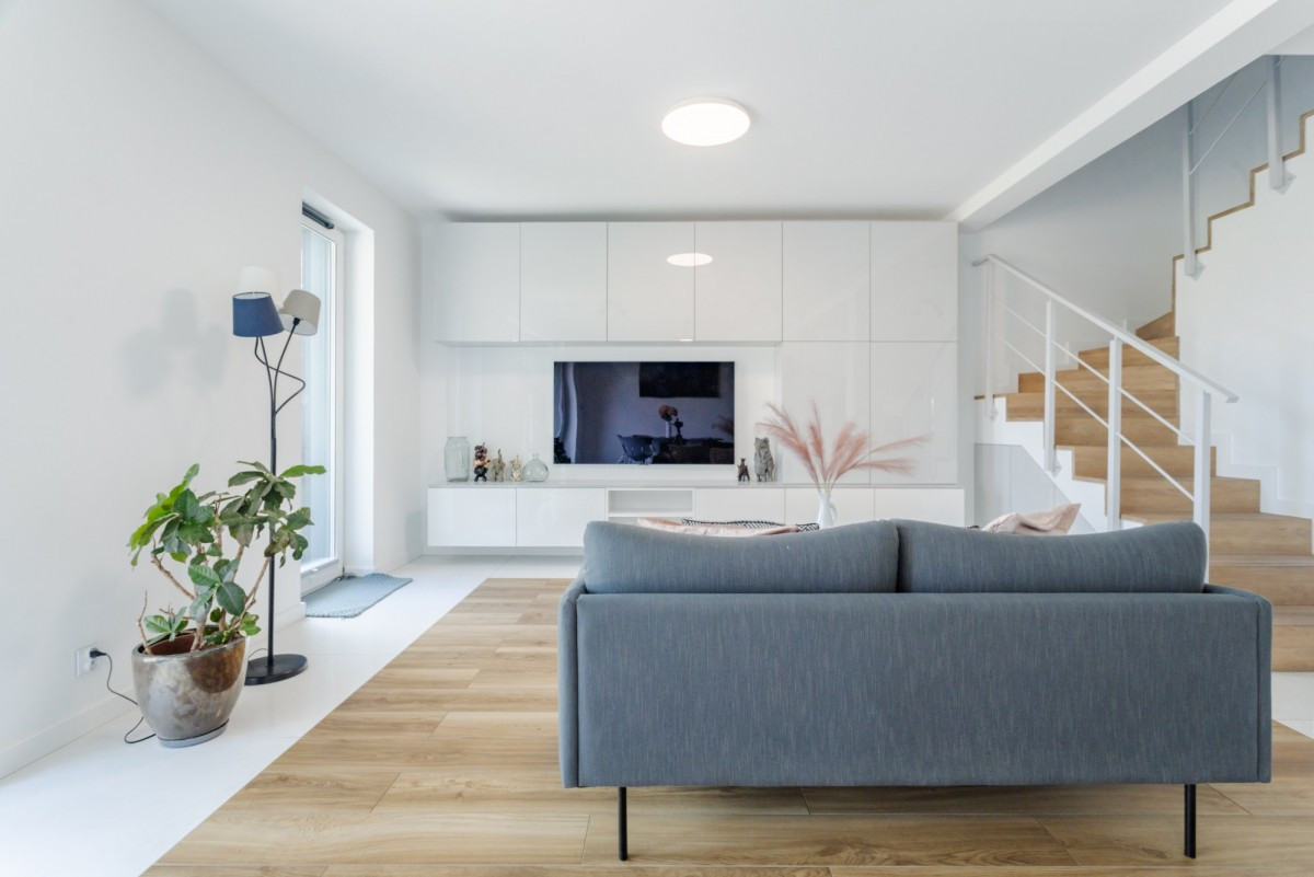 Na parterze znajduje się przestronny salon z aneksem kuchennym (44,6 m²) i jadalnią z bezpośrednim wyjściem do ogrodu od strony wschodniej. Duże przeszklenia wypełniają wnętrze naturalnym światłem od rana, tworząc przytulną i harmonijną przestrzeń.