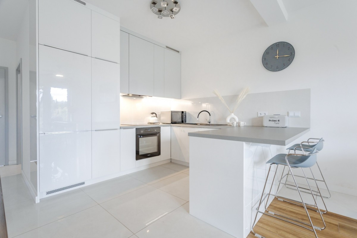 Kuchnia jest w pełni wyposażona w nowoczesny sprzęt AGD i elegancką zabudowę.