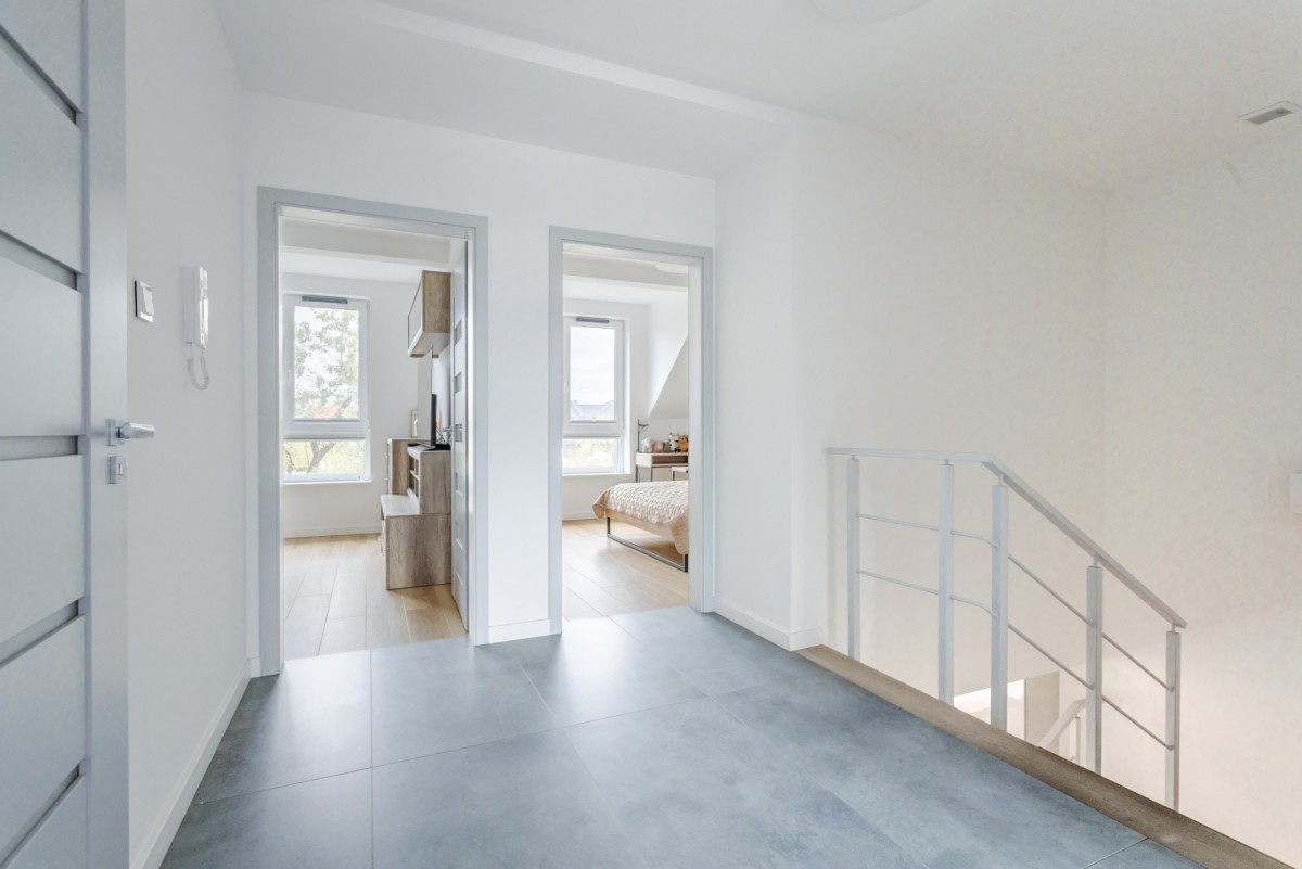 Nowoczesny, funkcjonalny segment środkowy o powierzchni całkowitej 172 m² (w tym poddasze ok. 24 m²), położony na działce o powierzchni 230 m².