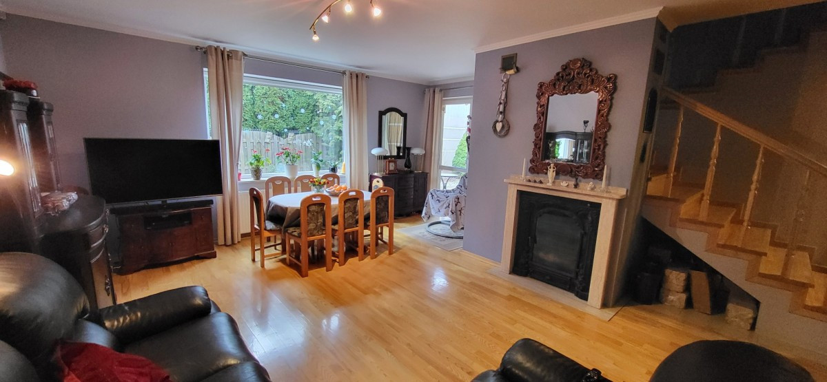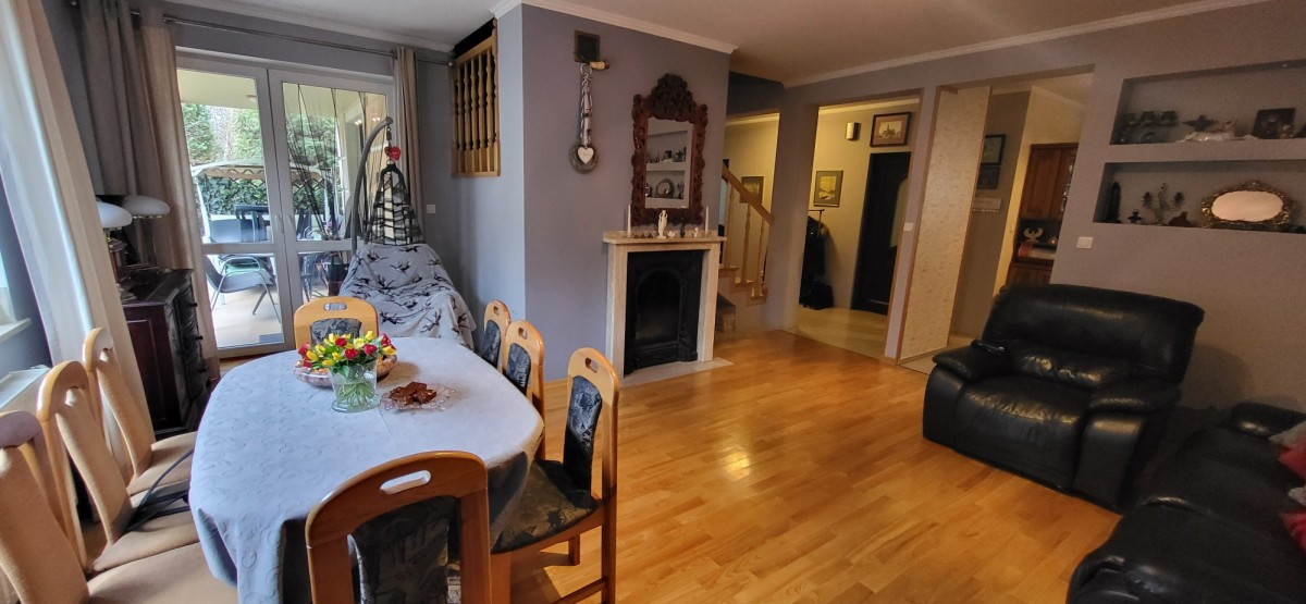 Parter: salon z pięknym kominkiem i wyjściem na taras/ogórd, kuchnia, spiżarnia, dwa pokoje i łazienka - garaż