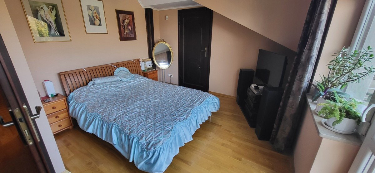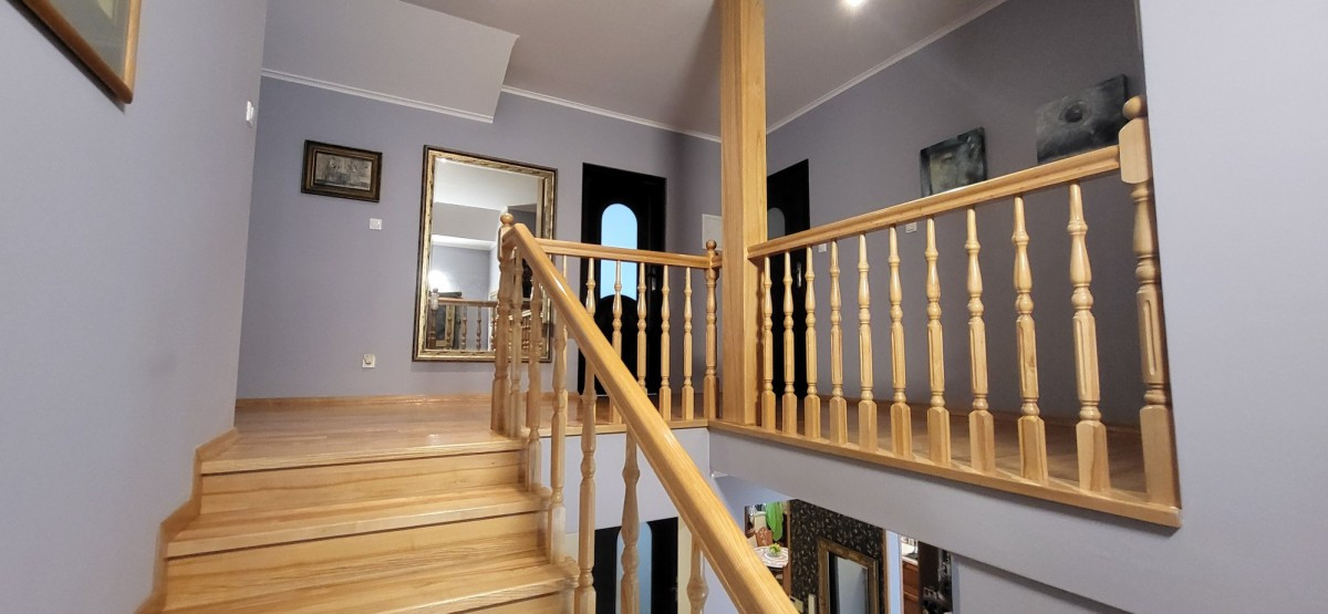 Piętro: trzy sypialnie (dwie z garderobami, jedna z balkonem), pomieszczenie gospodarcze/sypialnia, łazienka