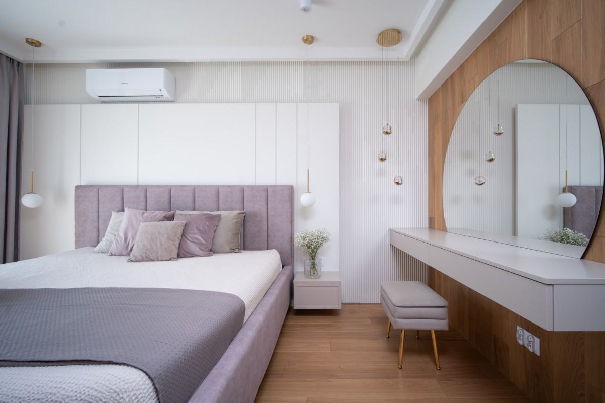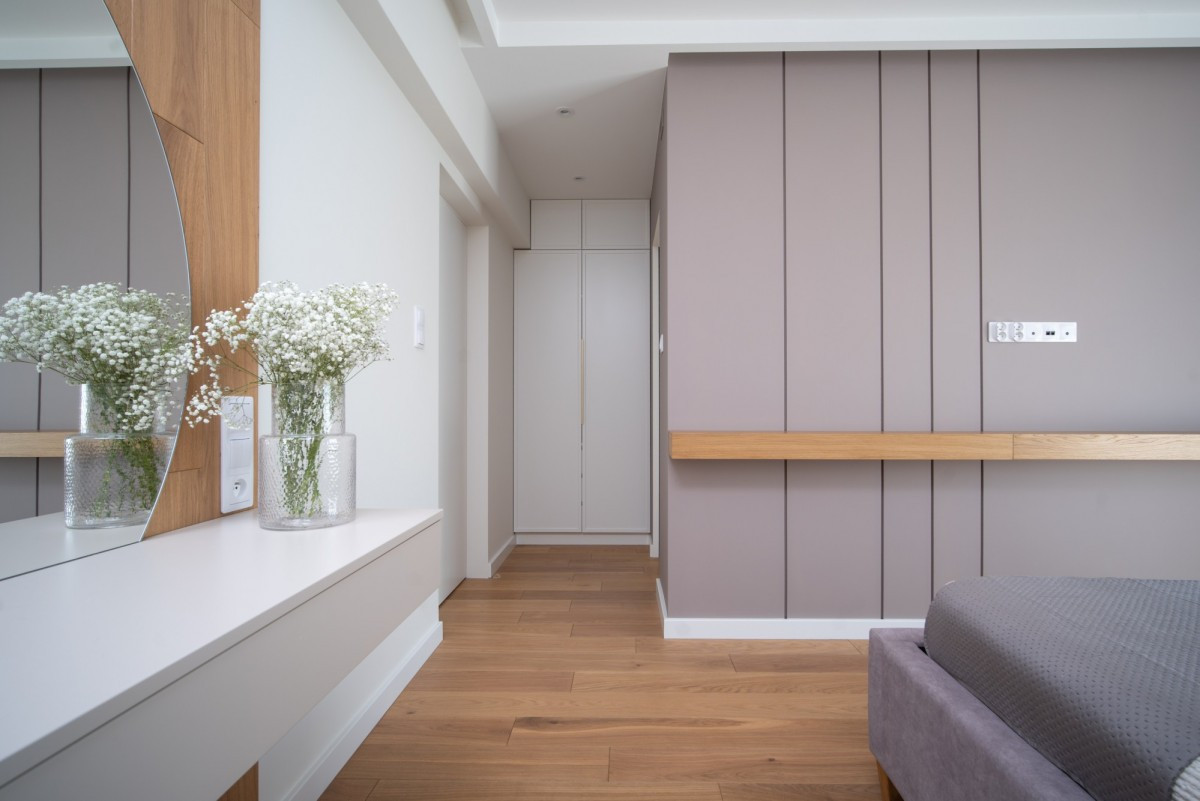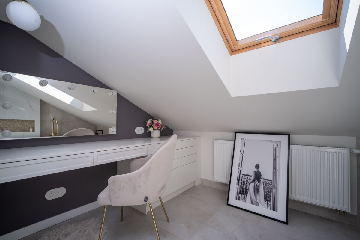 Master bedroom z elegancką toaletką oraz wydzieloną garderobą,