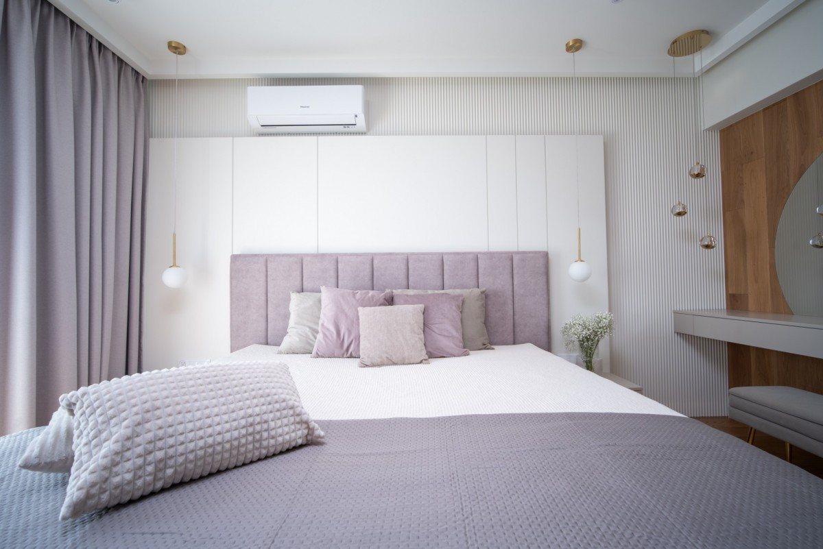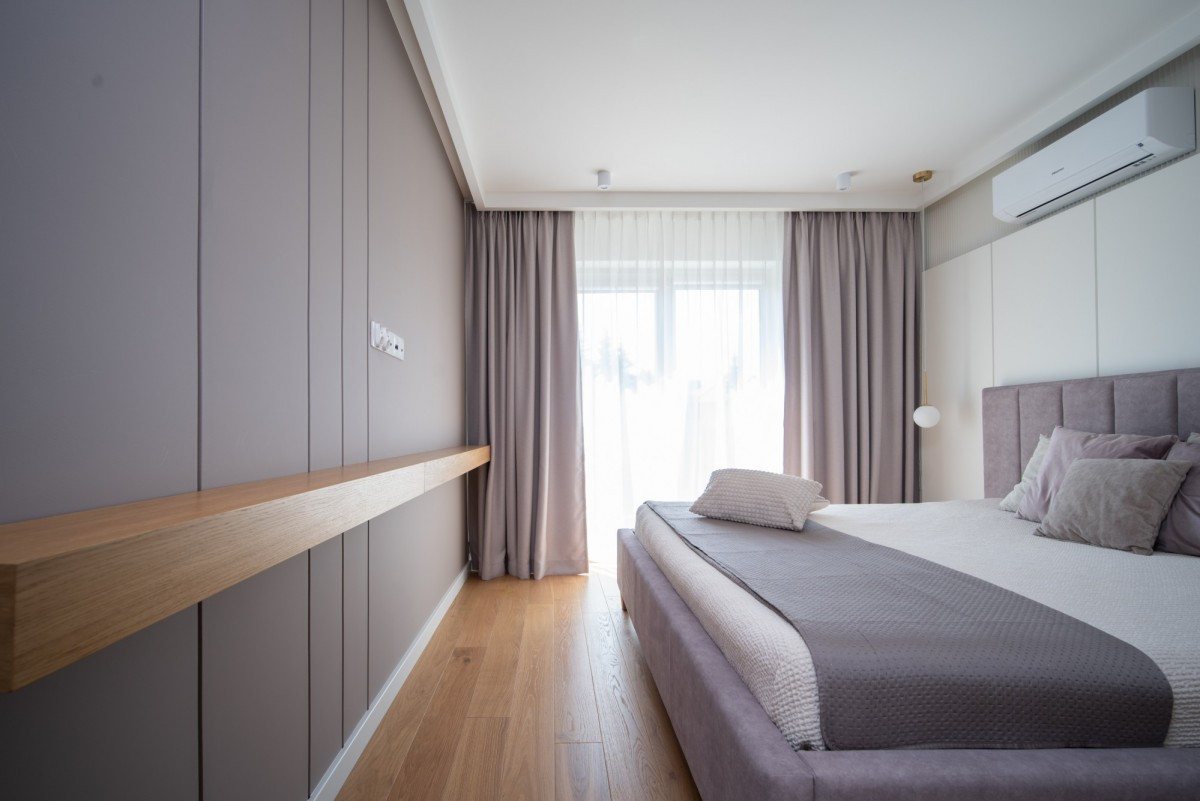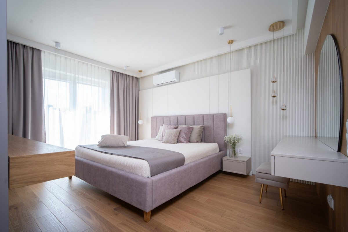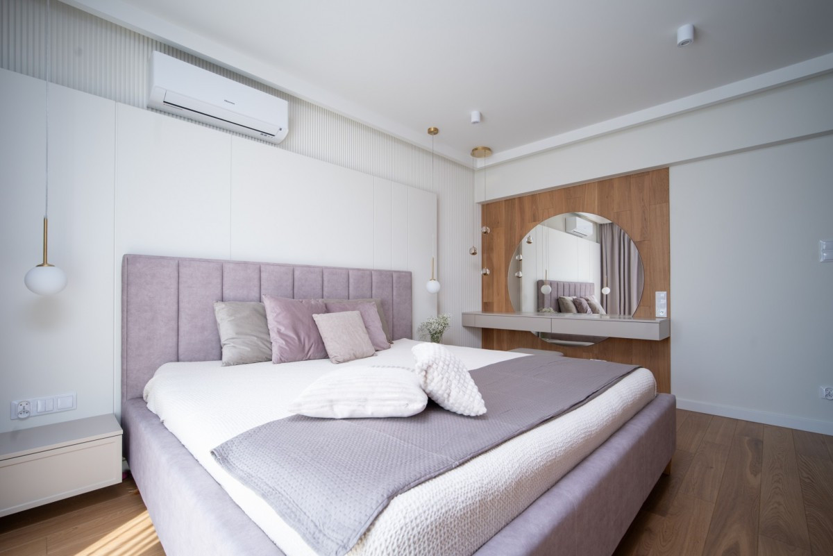 Master bedroom z elegancką toaletką oraz wydzieloną garderobą,