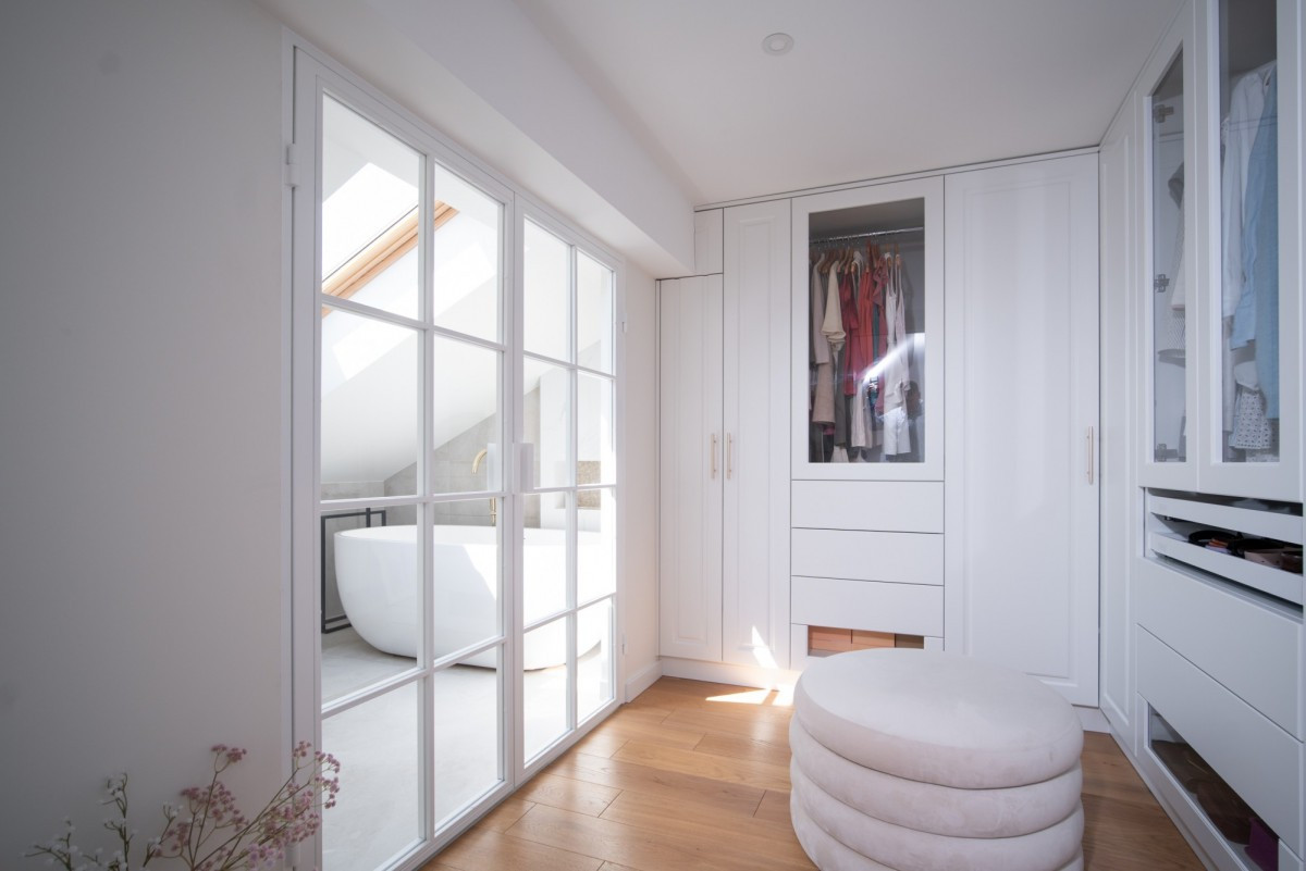 Przestronna garderoba z zabudową stolarską,