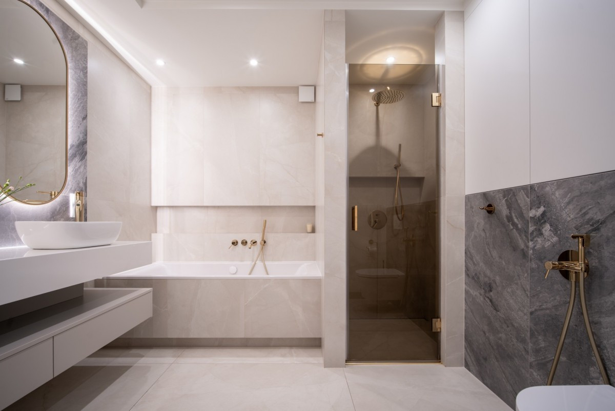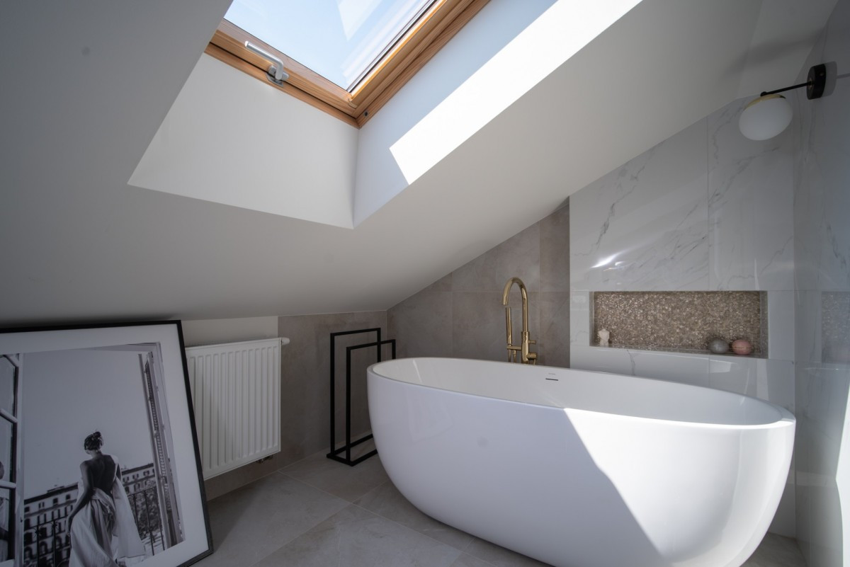 Przestronna łazienka z wanną wolnostojącą i przeszklonym prysznicem,