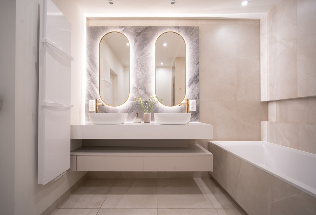 Pokój kąpielowy z wanną wolnostojącą oraz toaletką za przeszkleniem,
