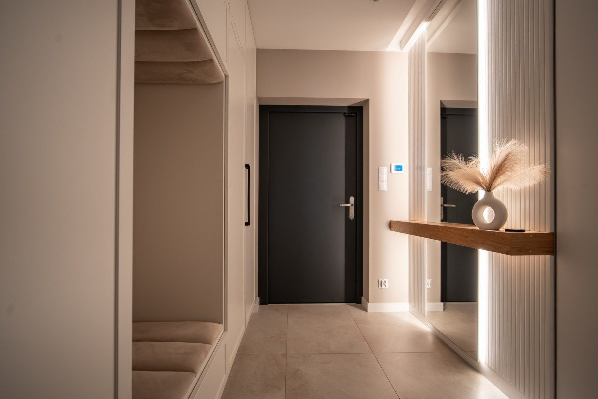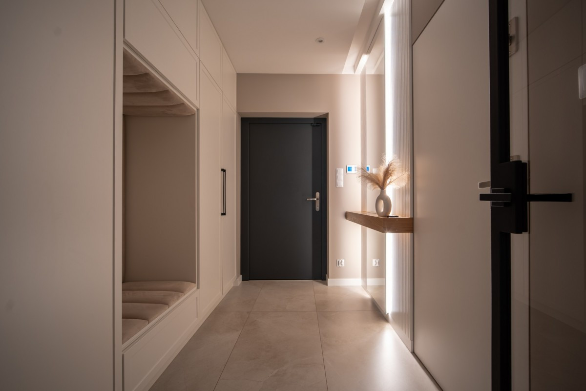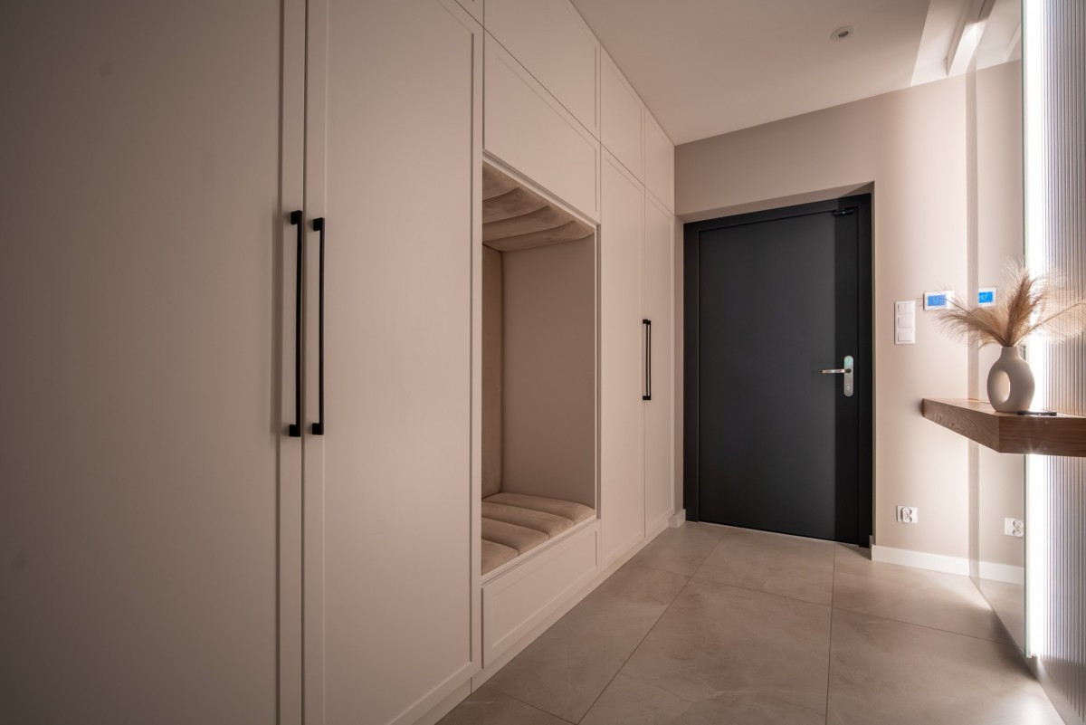 Reprezentacyjny wiatrołap z zabudowaną szafą, siedziskiem i dużym lustrem,