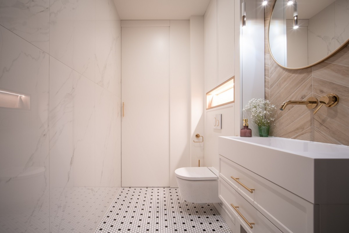 Stylowa toaleta z zabudowanym piecem gazowym i miejscem do przechowywania,