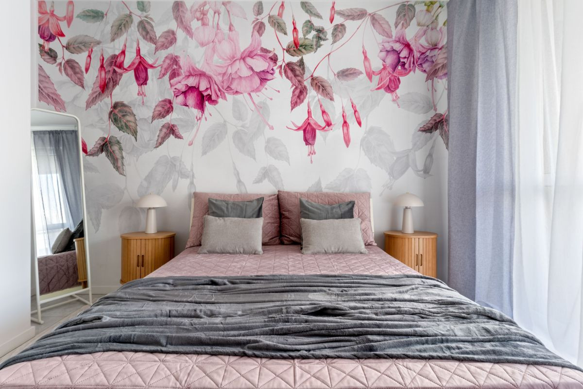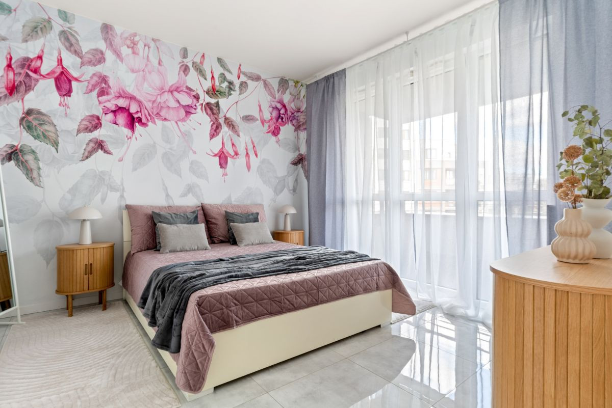 sypialnia z piękną tapetą i wyjściem na drugi balkon/loggię