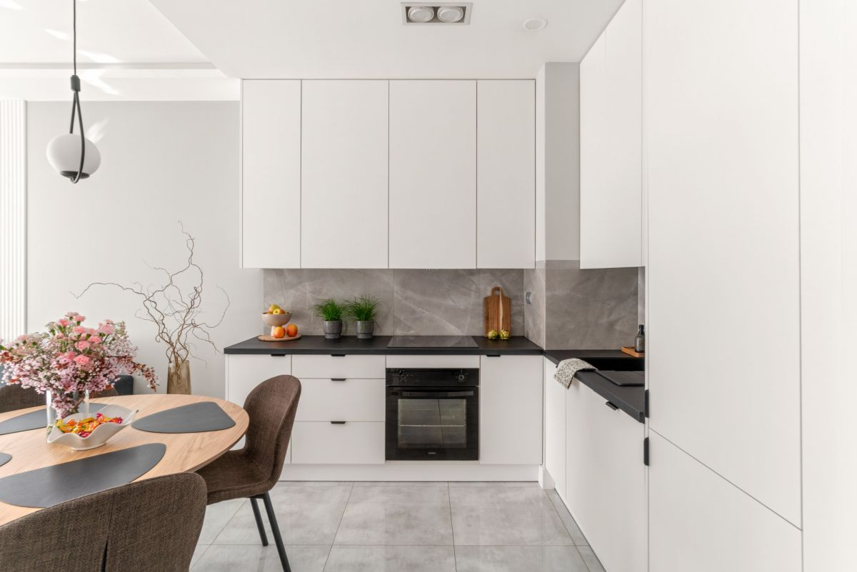 przestronny salon z aneksem kuchennym i wyjściem na balkon