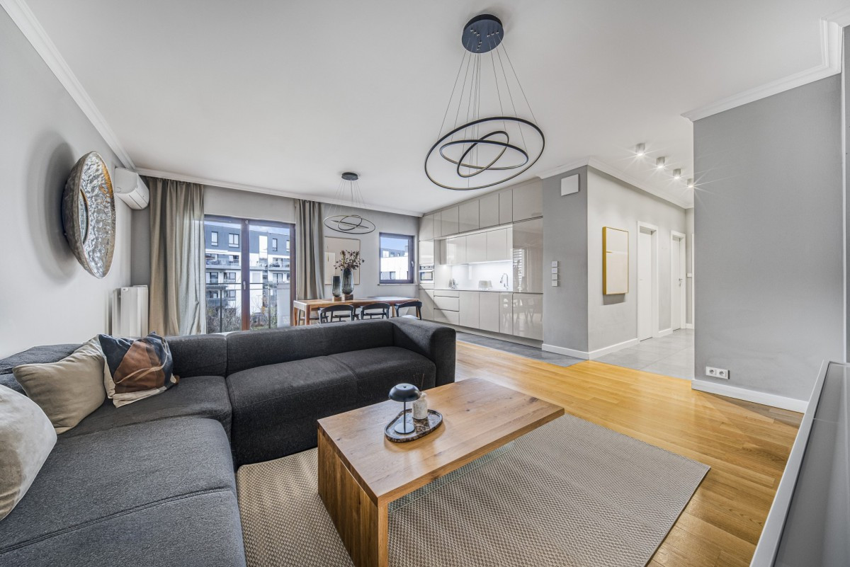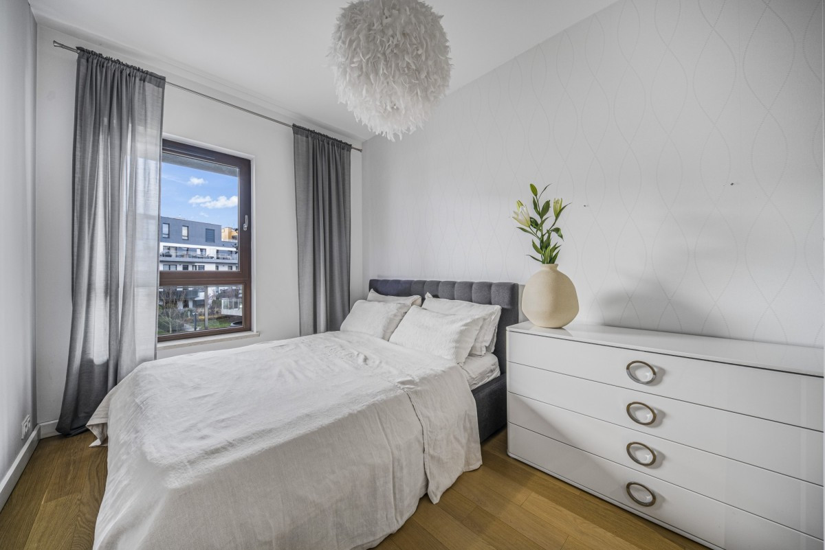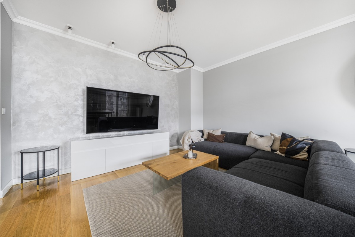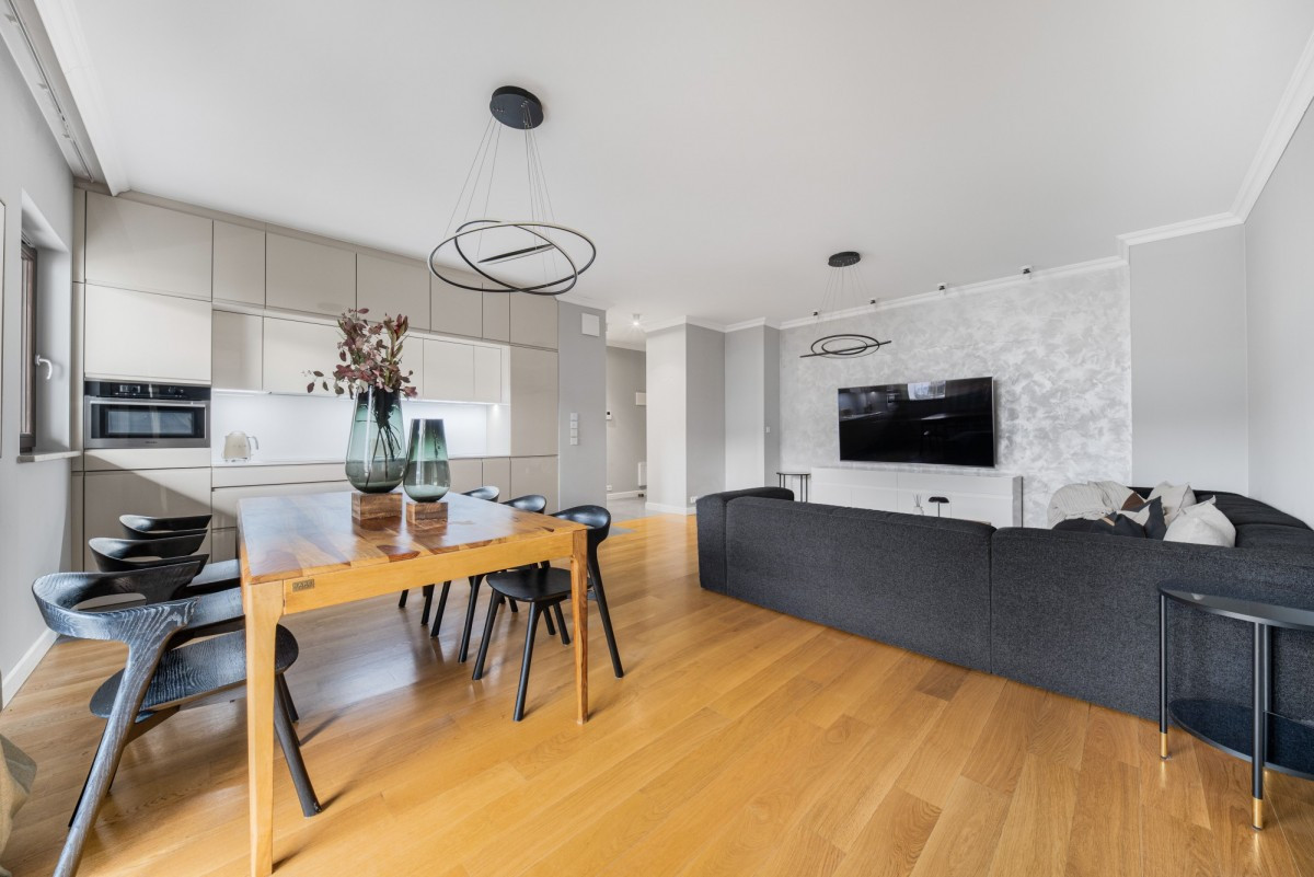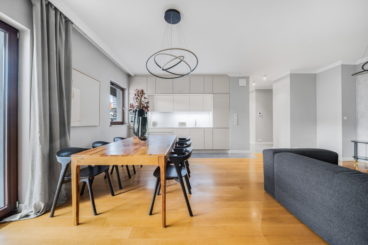 Wnętrze zostało zaprojektowane przez architekta z dbałością o każdy detal. Apartament wykończono w podwyższonym standardzie, z wykorzystaniem naturalnych materiałów - drewniana dębowa podłoga, meble na wymiar, nowoczesnej strukturze. Dominująca paleta barw w odcieniach bieli, beżu i szarości tworzy atmosferę spokoju, harmonii i ponadczasowej elegancji.